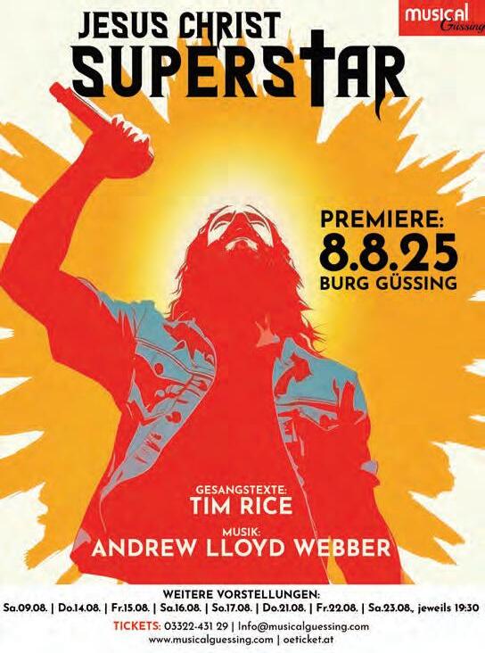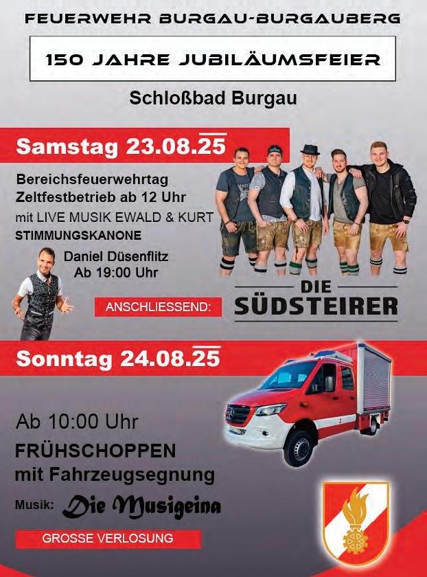 Bad Radkersburg: ABBA-Tribute-Konzert mit ABBA Mia, Toskana Garten im Vitalhotel der Parktherme, 20.00 Feldbach: „Feldbacher Sommerspiele: „Pasión Tango“, Konzert mit Friedrich Kleinhapl & Kim Barbier, Taborhof, 19.30 Güssing: Kultur Sommer Güssing: „Wiener Melange“, Kabarett mit Andreas Vitásek, Burg Güssing, 20.30 M. Hartmannsdorf: Rüsthaus- & Fahrzeugsegnung und Woazbrot’n der FF Pöllau bei Gleisdorf, ESV Pöllau/Gl., 15.00