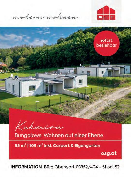 Gewinn für die Gemeinde und für alle, die sich leistbares Wohnen im Grünen wünschen! Die eingeschossigen Bungalows mit Grundstücksgrößen von 350 m² bis 740 m² – geplant vom Architekturbüro Schwartz – verfügen über Doppelcarports, Außenabstellräume, Luft-Wasser-Wärmepumpen zur Beheizung und PV-Anlagen am Dach. Alle Infos gibt’s unter www.osg.at oder telefonisch unter 03352/404 –DW 51 oder 52.