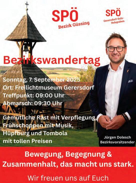 Friedberg: 37. Wechsel-Panoramastraßen-Bergrennen und Vereinsmeisterschaft Radclub Friedberg-Pinggau, Start beim Rüsthaus Pinnggau, 14.00 Hofstätten/R.: Bezirkswandertag der Senioren, Treffpunkt beim Gemeindezentrum, 8.00