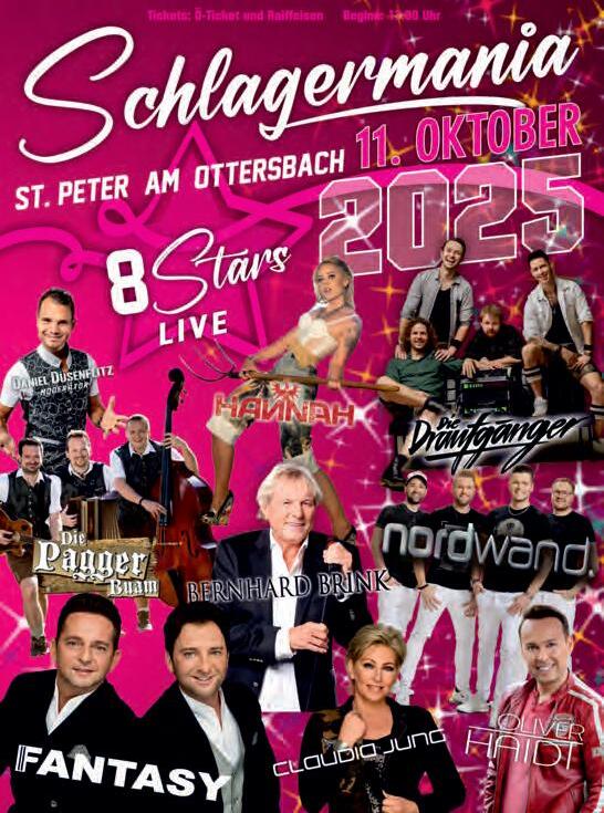 St. Peter/O. : Schlagermania mit Fantasy, Die Draufgänger, Claudia Jung, Bernhard Brink, Hannah uvm., Ottersbachhalle, 17.00 Thannhausen: Flohmarkt für Kinder- und Babysachen, Gemeindezentrum, 8.00-12.00