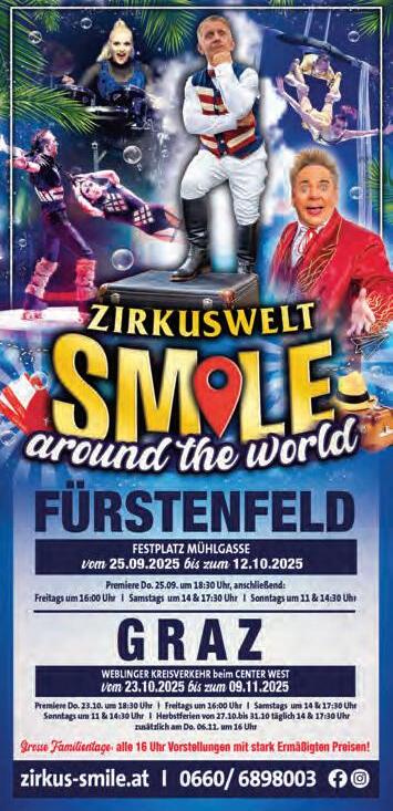 Die Zirkuswelt Graz präsentiert „Smile around the world“ –eine Show, die Herzen berührt und für unvergessliche Momente sorgt. Es erwartet Sie ein Feuerwerk aus Artistik, Musik, Theater und Humor –voller Lebensfreude und internationalem Flair. Ein Höhepunkt: Der bekannte Clown Don Christian, Publikumsliebling auf internationalen Bühnen, bringt mit seinem unverwechselbaren Charme Groß und Klein zum Lachen. Erleben Sie eine Show voller Staunen, Freude und Magie! Wir verlosen jeweils 5 × 2 Karten für die Vorstellungen in Fürstenfeld und Graz (Termine siehe unten). Für die Teilnahme einfach bis 02.10. eine Mail an gewinnspiel@soj.at schicken!
