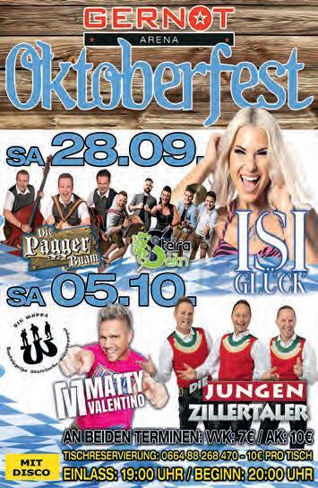 Jennersdorf: Oktoberfest mit Disco und Live-Musik von Isi Glück, Die Pagger Buam und Steira Seitn, Gernot-Arena, 20.00 (bis 5.10.)