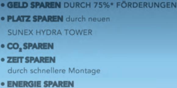 GELD SPAREN DURCH 75%* FÖRDERUNGEN • PLATZ SPAREN durch neuen SUNEX HYDRA TOWER • CO 2 SPAREN • ZEIT SPAREN durch schnellere Montage • ENERGIE SPAREN