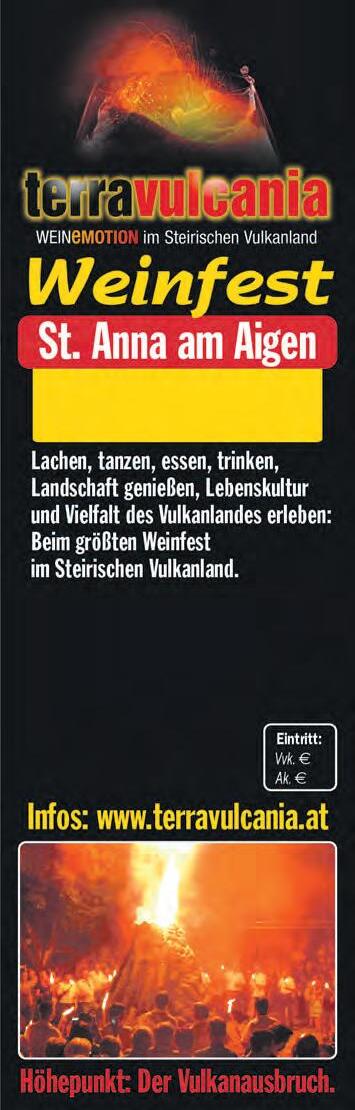 Kornberg: „Klangvolles zum Thema Liebe“, Stadtchor Feldbach, Schloss Kornberg, 19.30 St. Anna/A.: Weinfest, Ortszentrum, ab 16.00