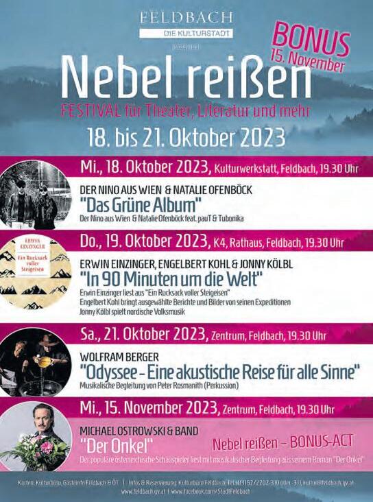 Feldbach: Wandern Wandergr. „Miteinander aktiv“, Start „Das Herbst“ Gniebing, 14.00 Gnas: Chribulas Vorlesestunde, Buchhandlung Chribula, 14.00