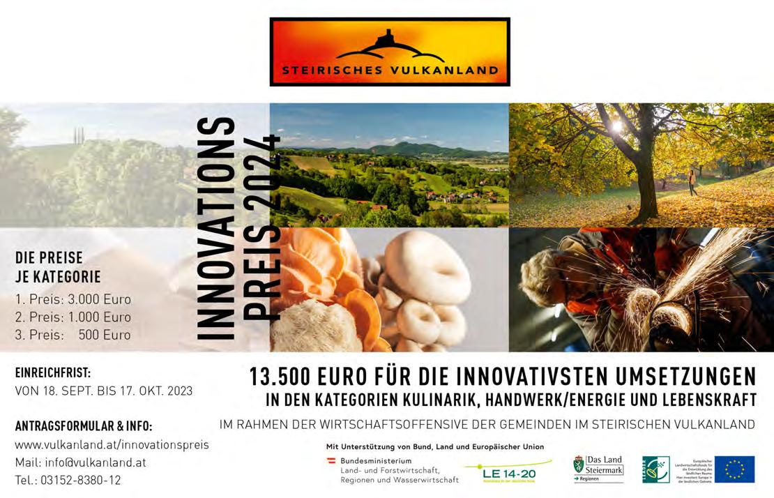 Schutz unserer Umwelt leistet. Regionsvorsitzender LAbg. ÖkR Franz Fartek betont: „Es ist großartig zu sehen, mit welchem Engagement in der Region für und mit jungen Menschen innovative und lösungsorientierte Projekte ins Leben gerufen und umgesetzt werden. Der Jugendinnovationspreis holt zum einen aktuelle Projekte und deren Initiatoren vor den Vorhang und inspiriert und motiviert zum anderen auch weitere, sich der Lebenswelt junger Menschen in der Region verstärkt anzunehmen“, so Fartek. Weitere Informatioenen zum Jugendinnovationspreis gibt es auf www.jugend.vulkanland.at.