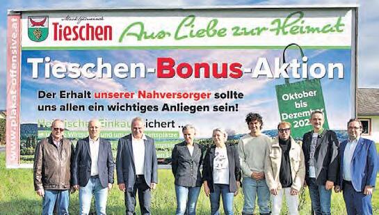 Tieschen lädt ab sofort und bis zum Jahresende wieder zur TieschenBonus-Aktion. Jeder Bürger mit Hauptwohnsitz in Tieschen kann seinen Einkauf bei den drei Nahversorgern im Ortskern (Bäckerei Prahsl, Kaufhaus Puntigam & Fleischerei Tschiggerl) im „TieschenBonus-Pass“ vermerken. Auch in der CitiesApp können die Rechnungen gescannt werden. Pro 10 Euro Rechnungsbetrag gibt es ein Los. Bei 33 Losen bzw. Stempeln mit ei-