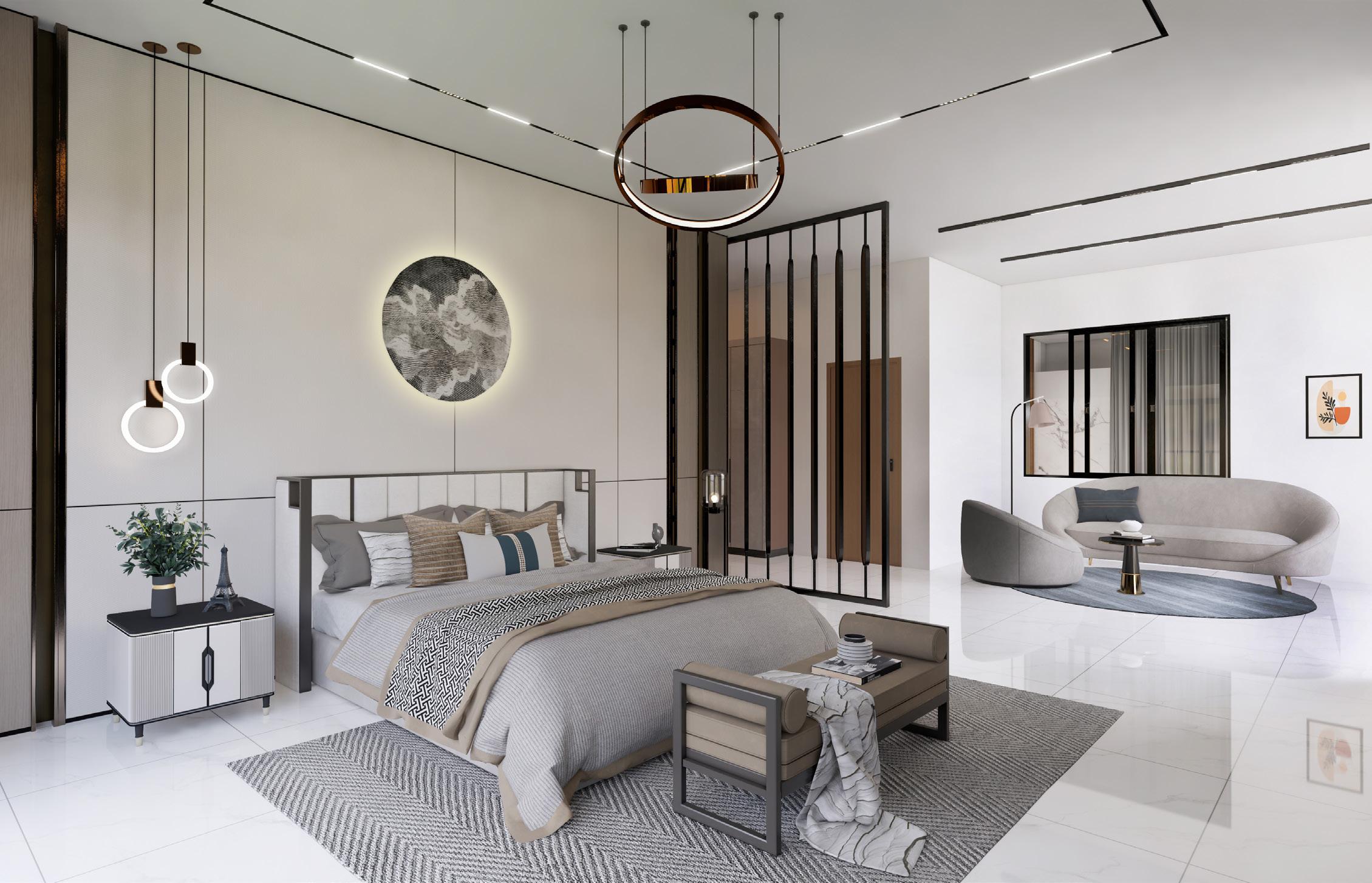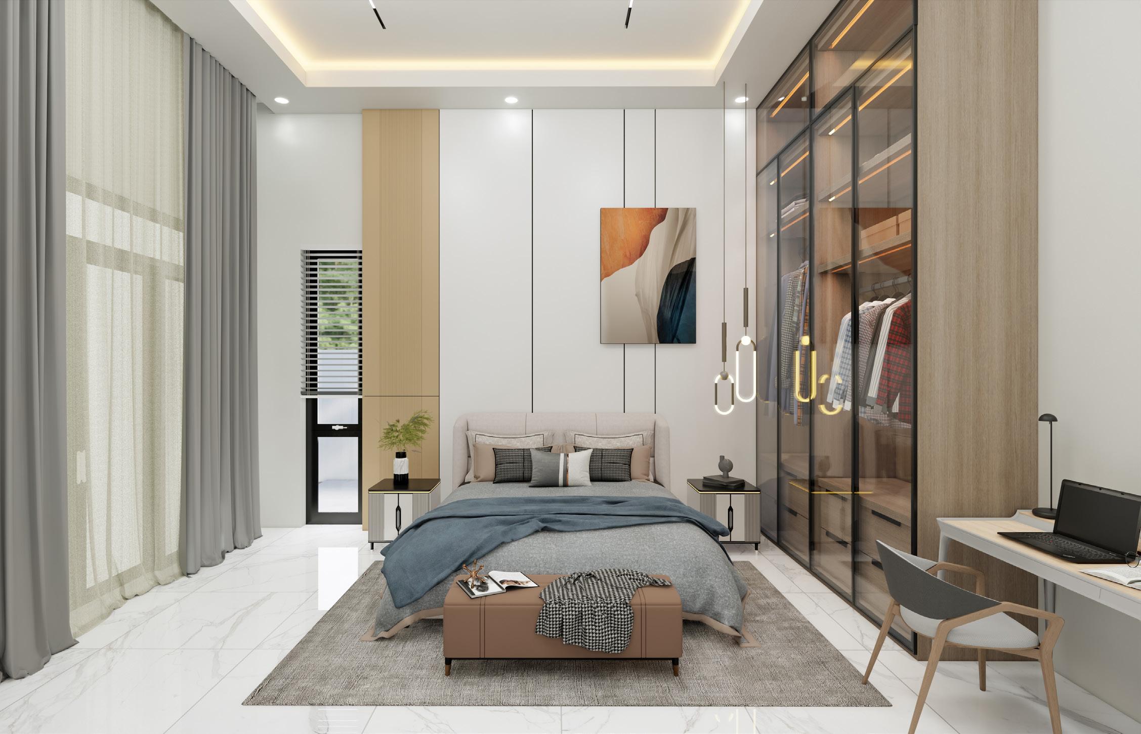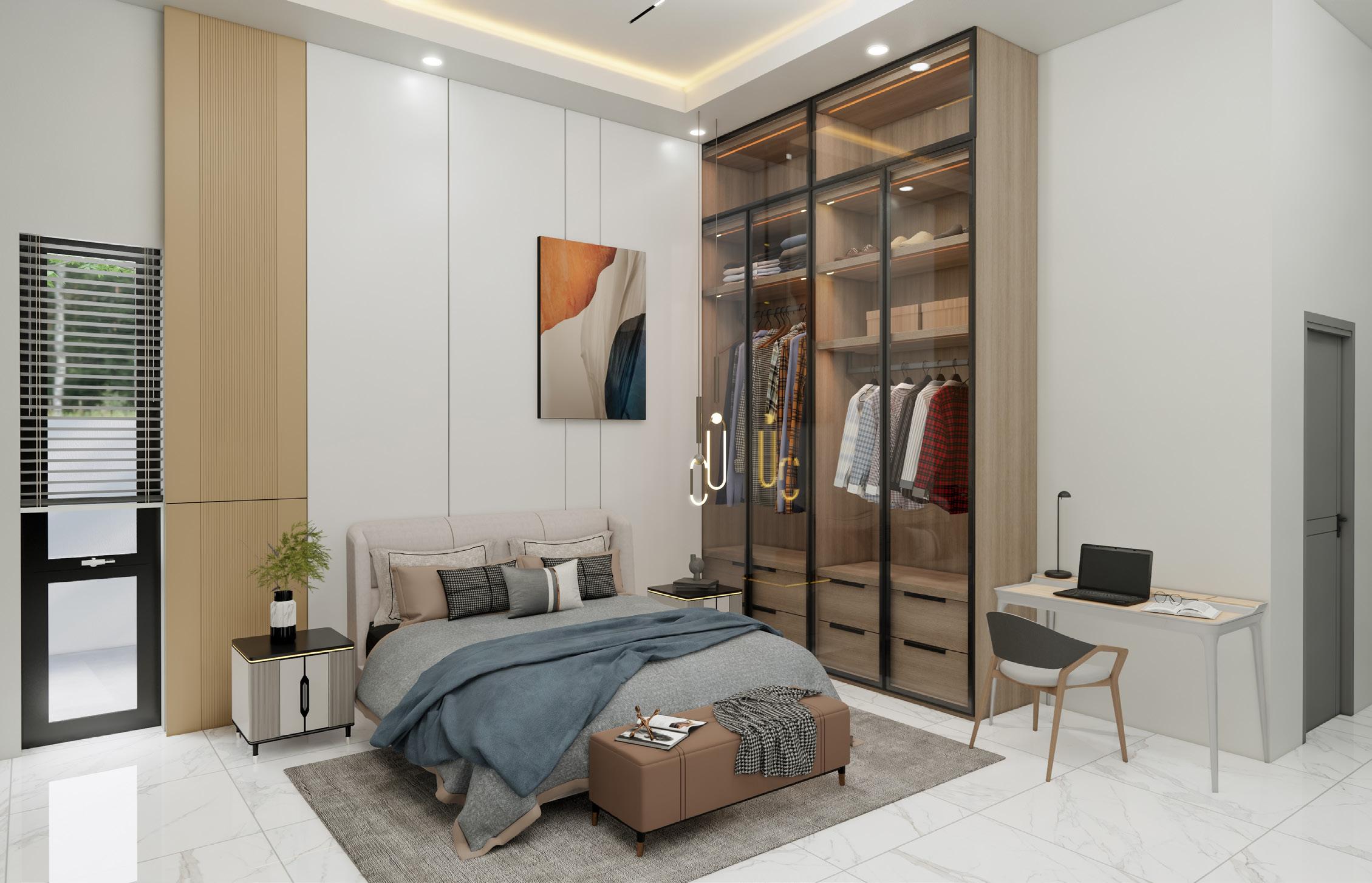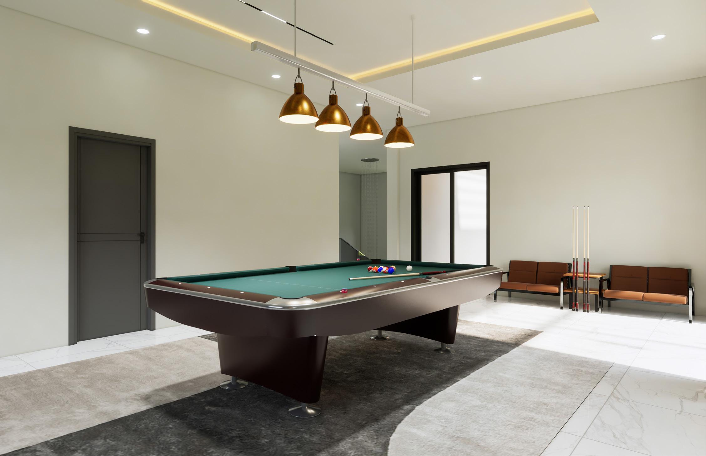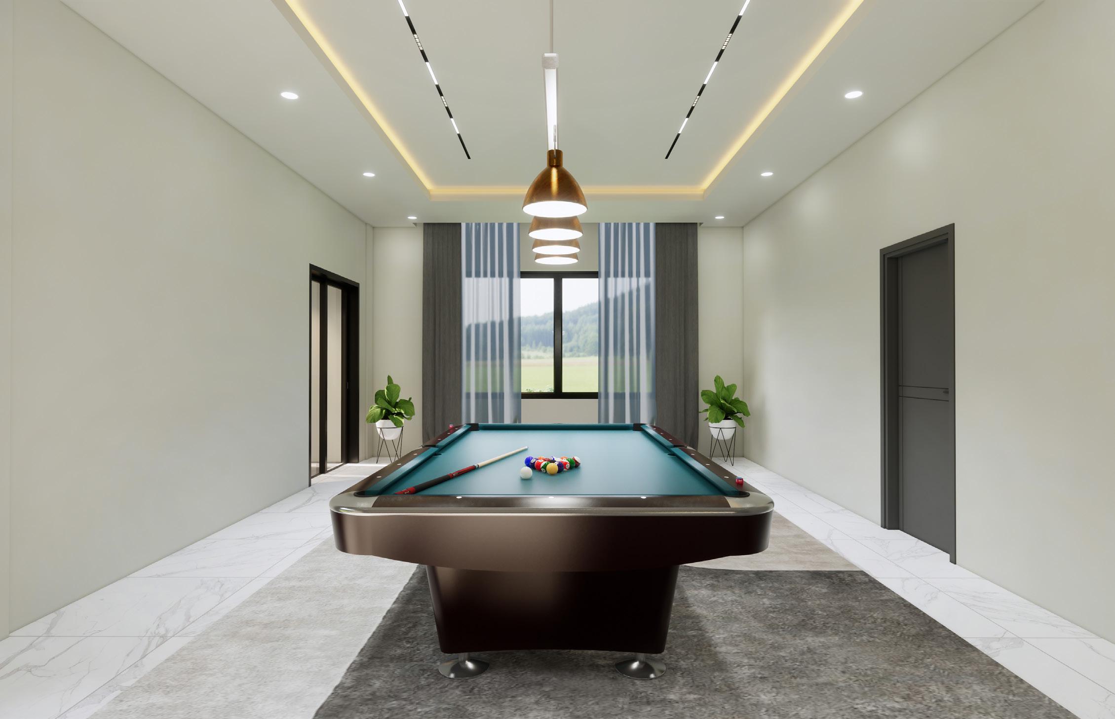The ground floor comprises the entrance hall, study room, living room, guest room, and open kitchen. The staircase leading to the next floor is covered in wooden material and emphasised by a glass handrail. The first floor is a place for the owner, which includes the master bedroom and family room. There is also a snooker room and a cinema room on the second floor.
