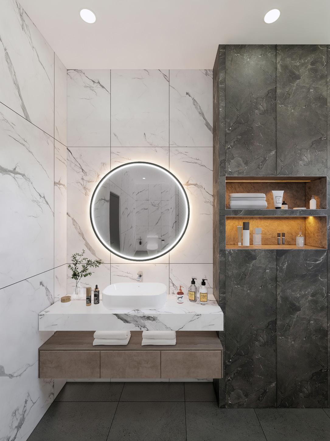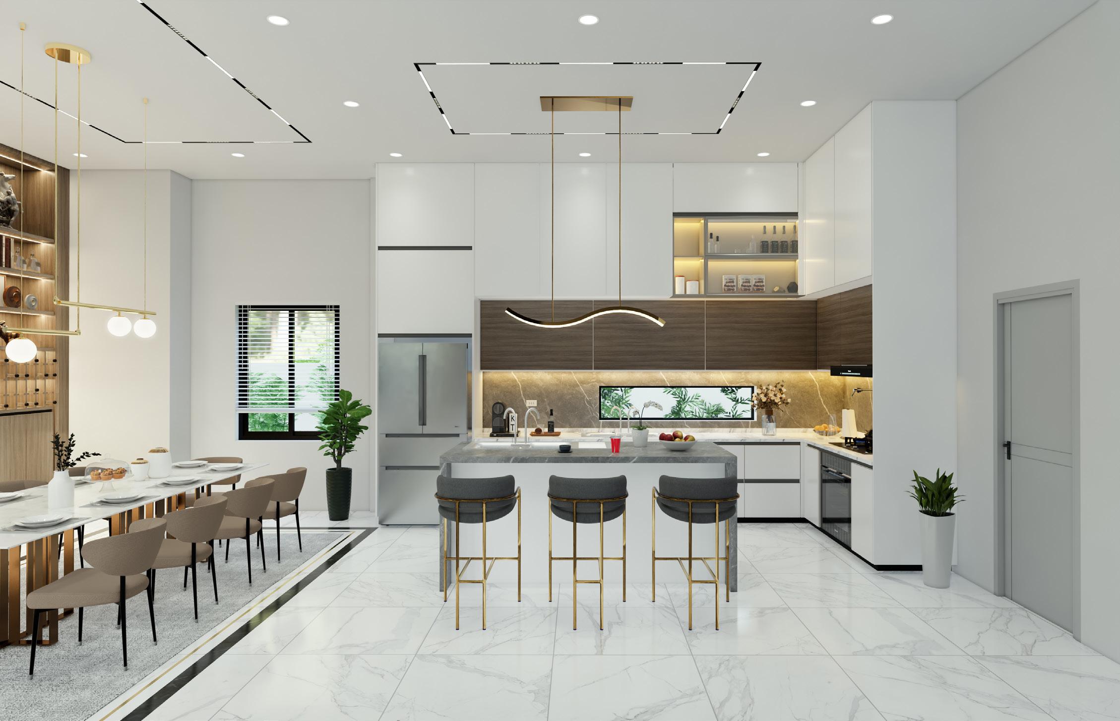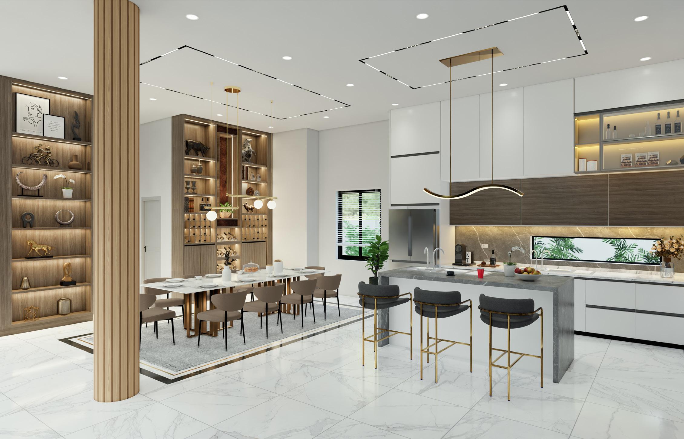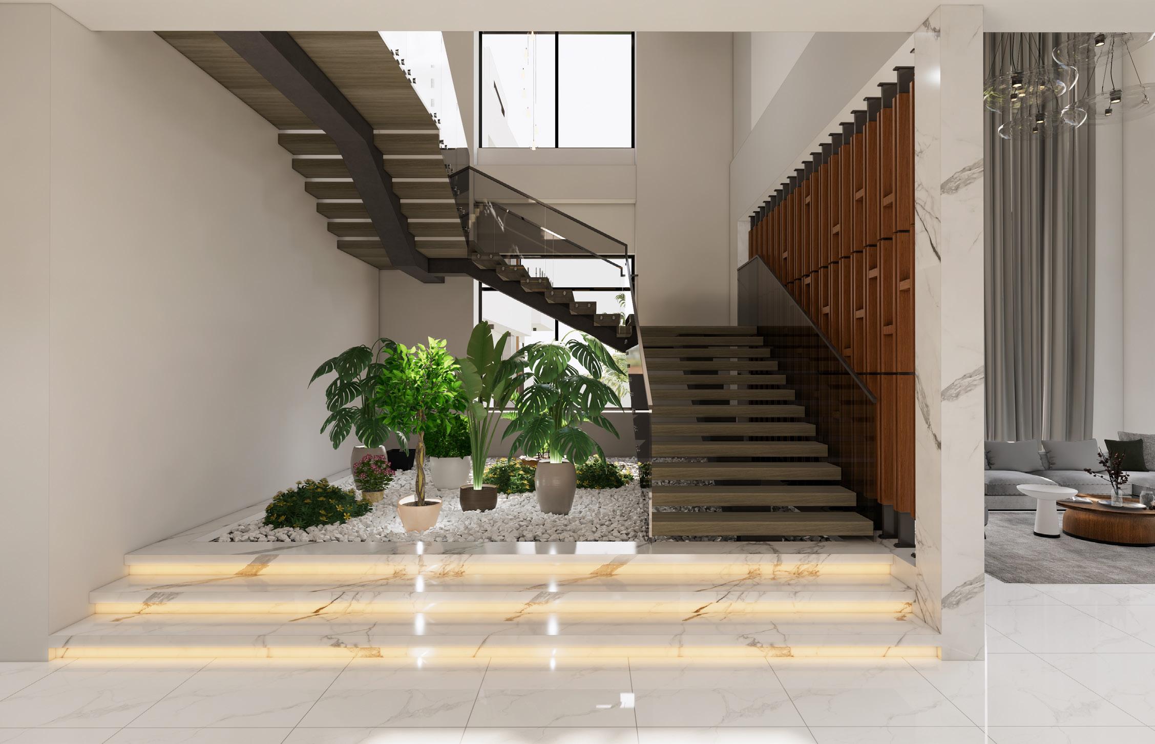 TThe use of marble and wood creates a sense of modernism and tranquility. The living room’s double height provides a sense of spaciousness and generosity.