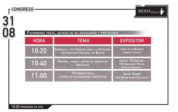 El Congreso se desarrolló de forma virtual a través de la plataforma Streamyard en dos días: https://modartesanalconidentidadcultural.expolatam.com/ con enlace directo por facebook live Congreso de Moda Artesanal - Bolivia