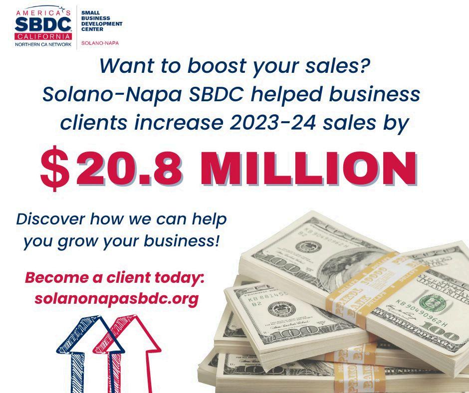 In the past year alone, the Solano-Napa SBDC has helped local businesses boost their sales by an incredible $20.8 million! Imagine what we can do for your business—join Solano County’s growing community and unlock new opportunities for success. Become a client today!