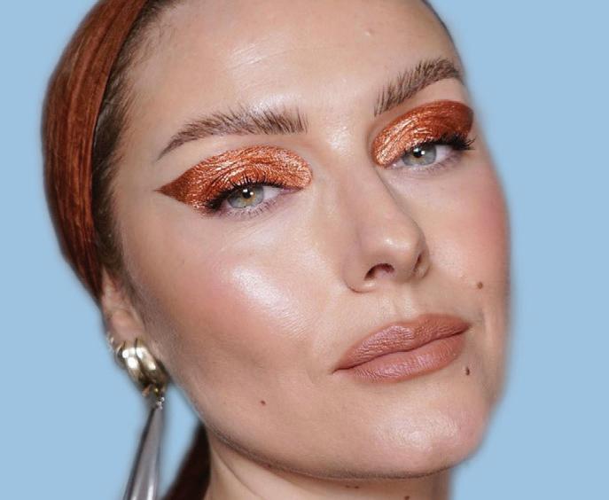 Choose a cream or liquid shimmer shadow in a shade that contrasts with the depth of your skin. Use a flat eye shadow brush to apply the shadow in a thick wing that extends up your lid and above your crease. You can use an eyeliner brush dipped in micellar water or a makeup wipe to clean up the edges.