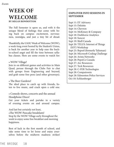 The Fall Semester is upon us, and with it the unique blend of feelings that come with being back on campus: excitement, nervousness, nostalgia, and just a tiny bit of dread. Thankfully, the UASU Week of Welcome (WOW), a week-long event hosted by the Student’s Union, is back for another year to help ease the backto-school angst and fill the time between syllabus classes. Here are some events to watch for: • WOW Village! Join in on different games and activities in Main Quad, peruse through the Clubs Fair to chat with groups from Engineering and beyond, and grab some free pens (and other giveaways). • The Beer Gardens! The ideal place to catch up with friends, listen to live music, and crack open a cold one. • Comedy shows, concerts and the annual