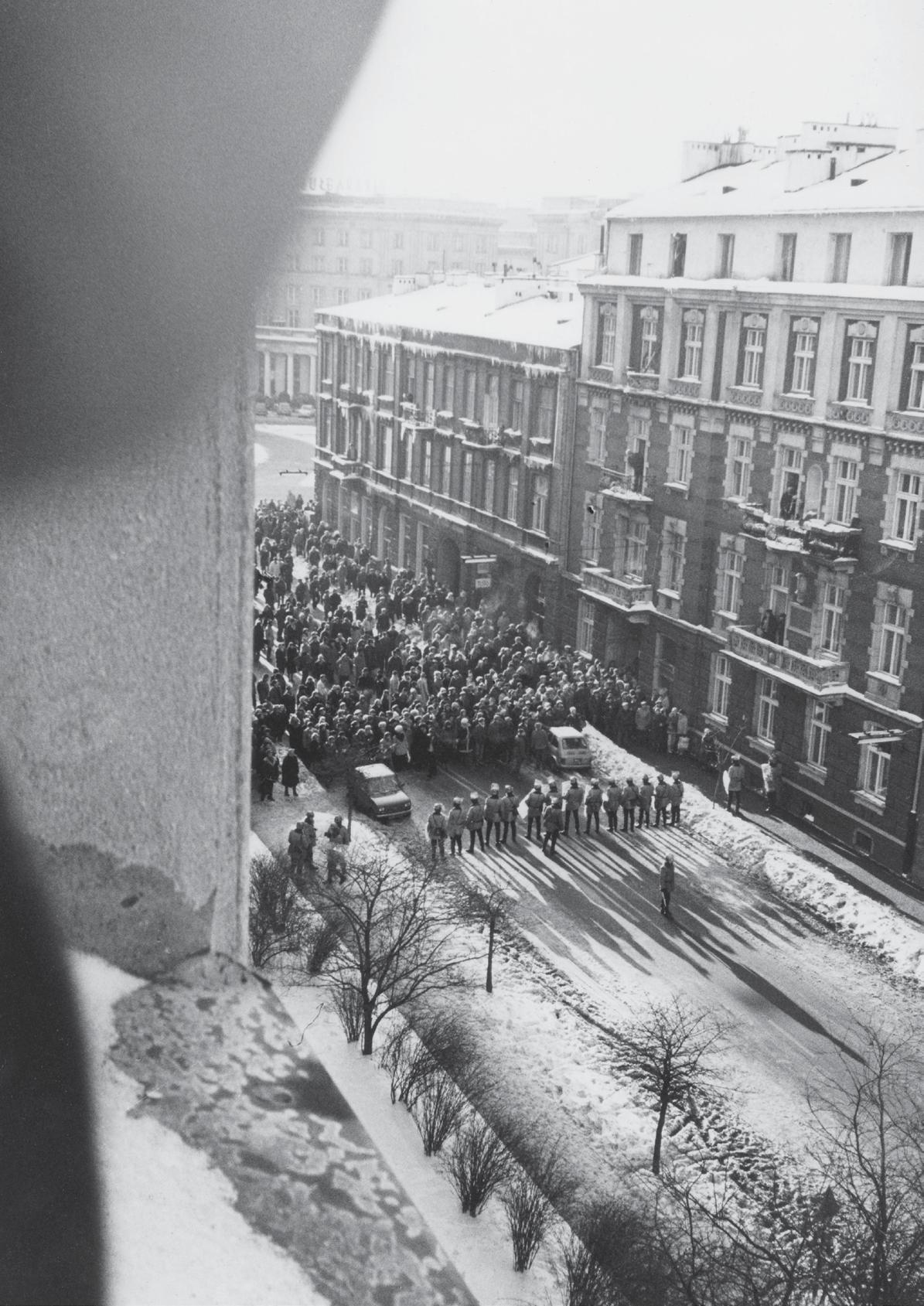 Pierwszy dzien Stanu Wojennego. Warszawa 13.12.1981 N/z: milicja blokuje ludzi na ulicy po ewakuacji siedziby Solidarności na ul. Mokotowskiej. Fot. Wojtek Laski / East News