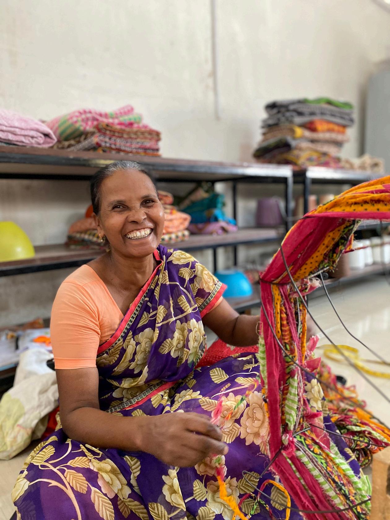 OurIndianworkshopspecializesincreatingdistinctivehandmadeitems, utilizingrecycledsarifabricsandothernaturalfibressuchaswool,jute,and organiccotton Weincorporatetraditionalskillssuchashandweaving,the kanthastitchandcrochet,tocreatehandcraftedrugs,jackets cushions throwsandotheritems Sustainabilityguidesourchoiceofmaterialsand techniques,ensuringresponsibleandfairproductionpractices
