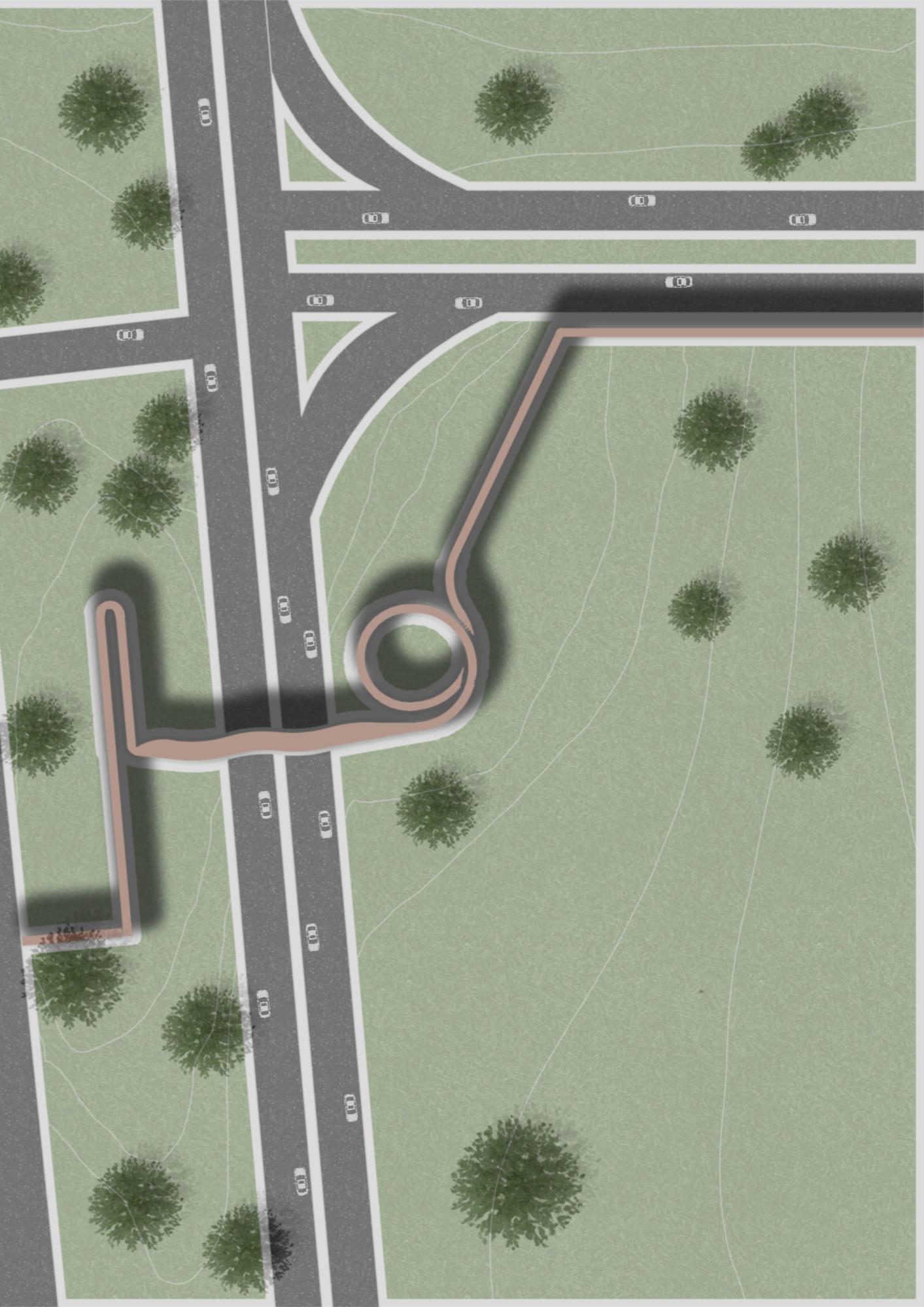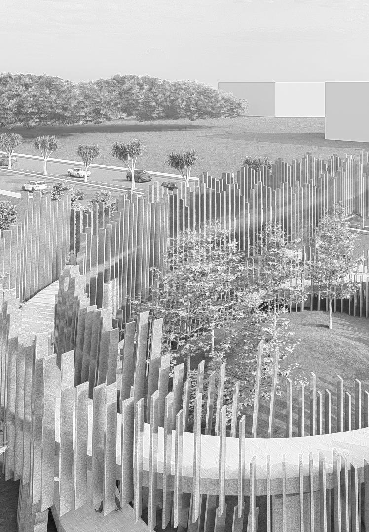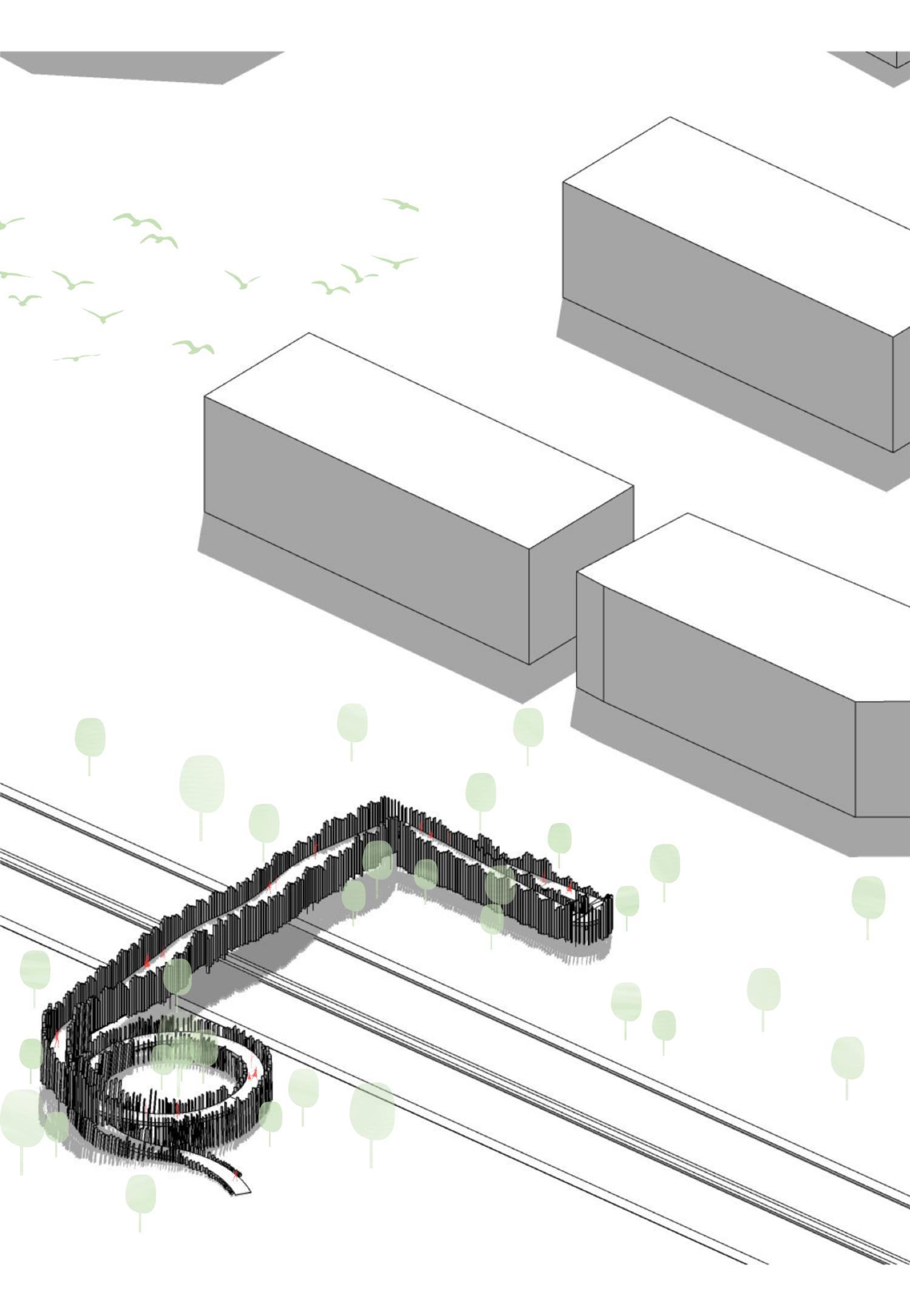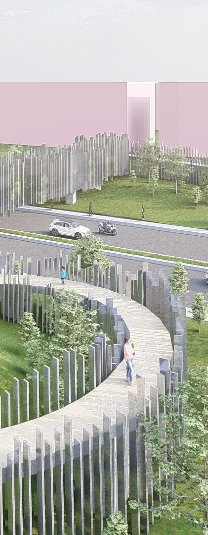 Buffer Zone & Greenery strategically integrates artificial hills as a buffer zone encircling the site's context, effectively mitigating noise pollution while infusing the surroundings with lush greenery.
