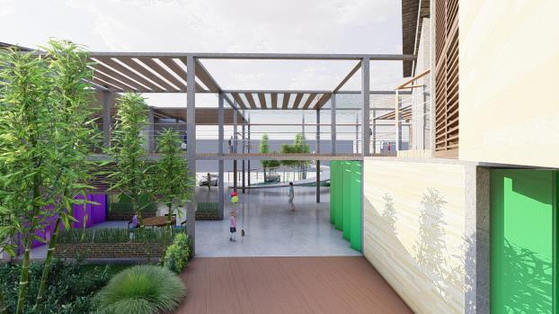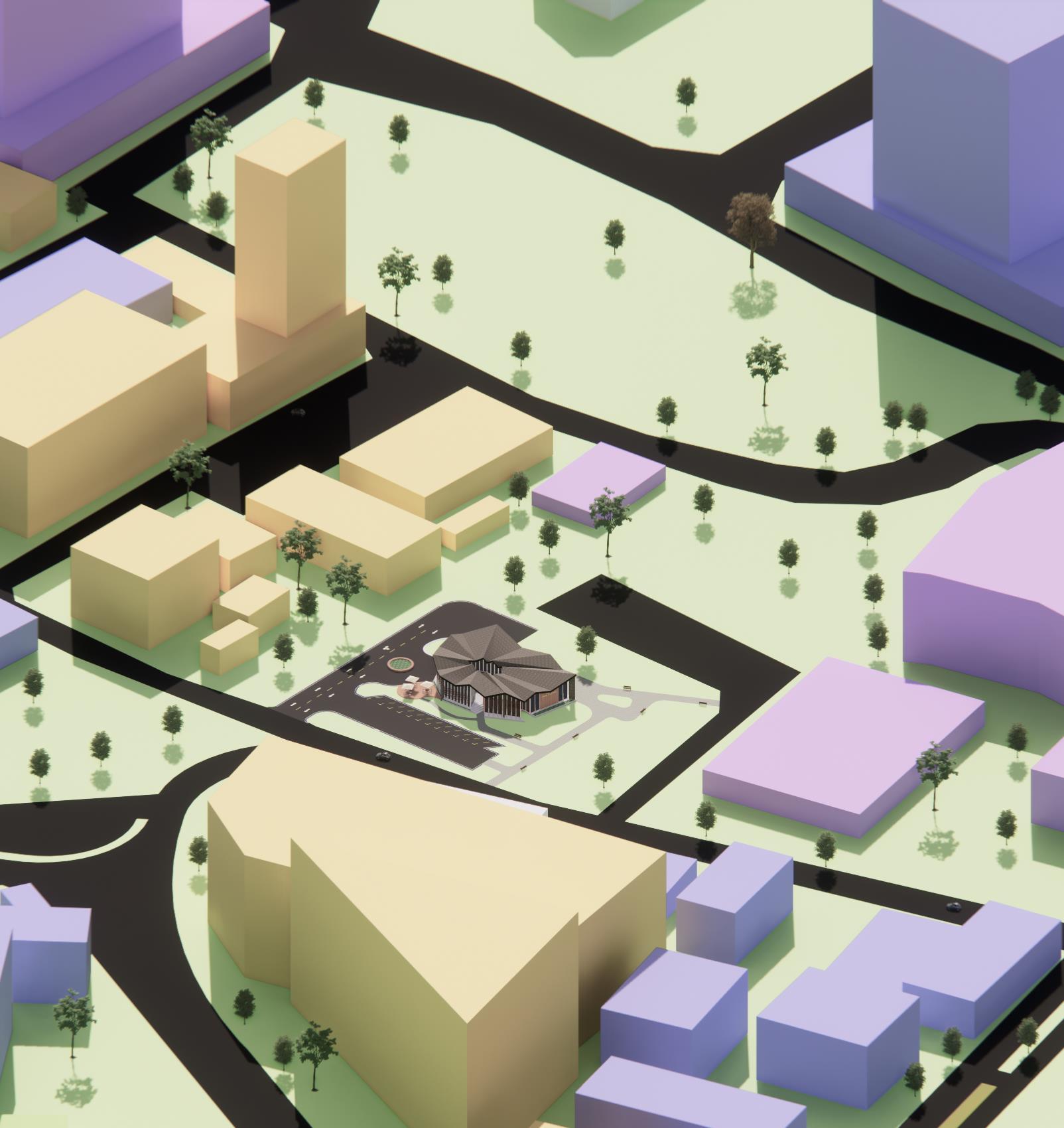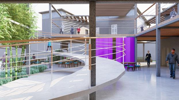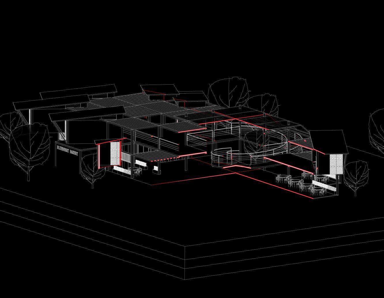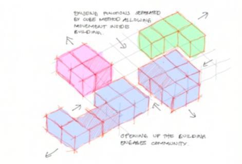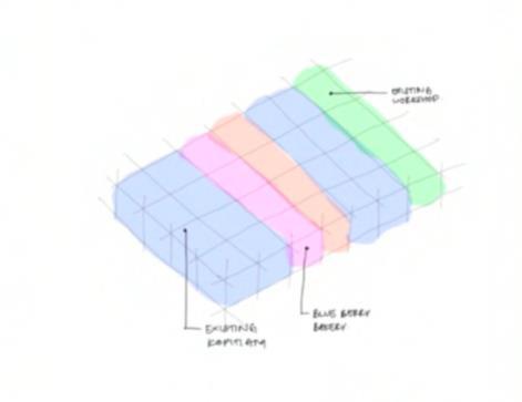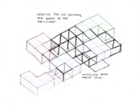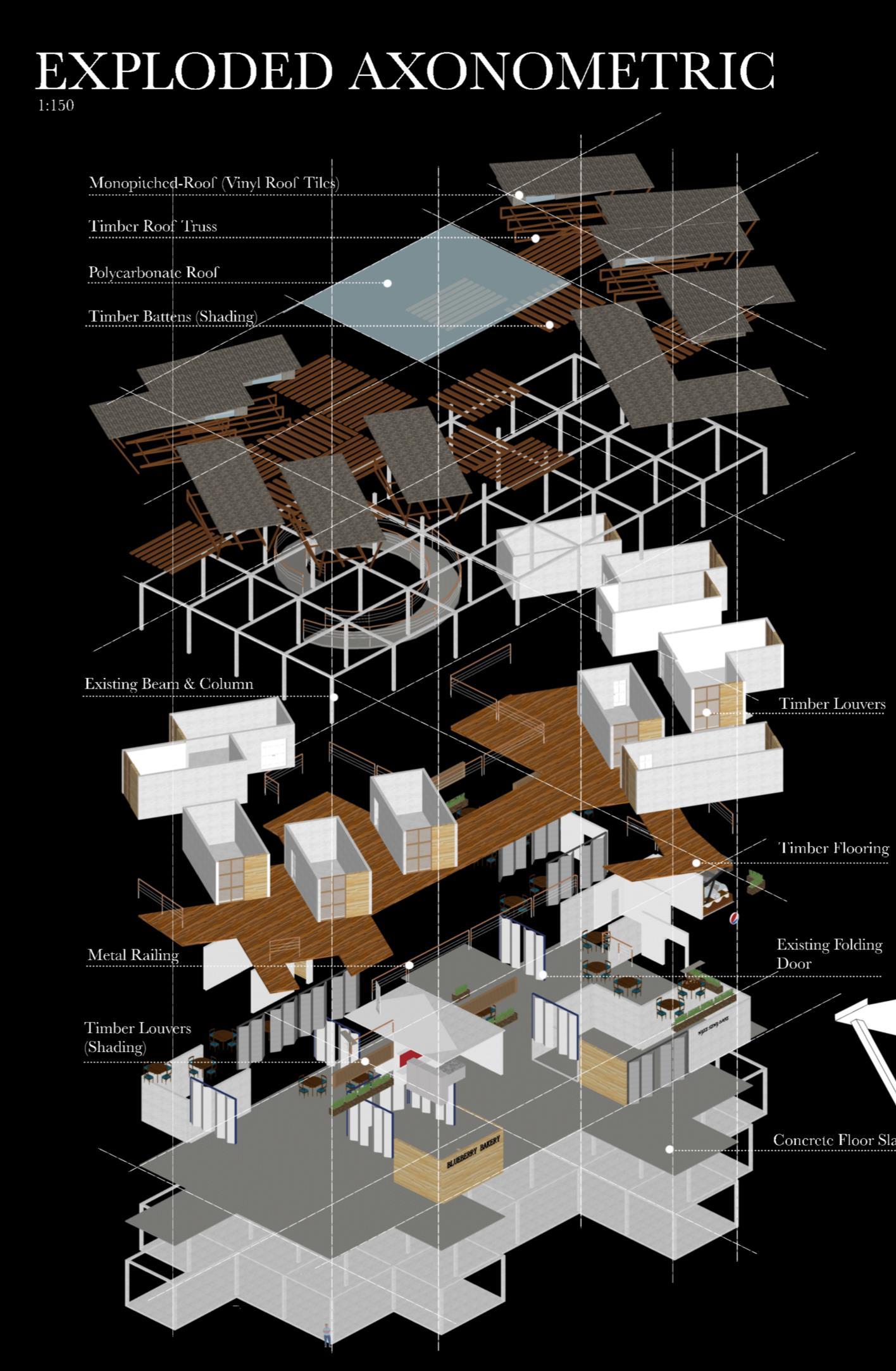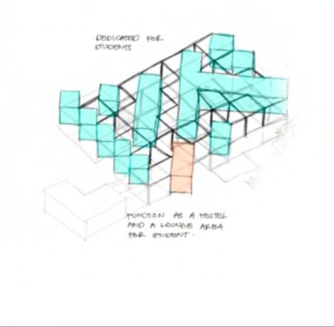 Utilizing a cube-based approach to segregate existing functions, aligning with the building's current structural beams and columns to facilitate internal circulation while fostering community interaction.