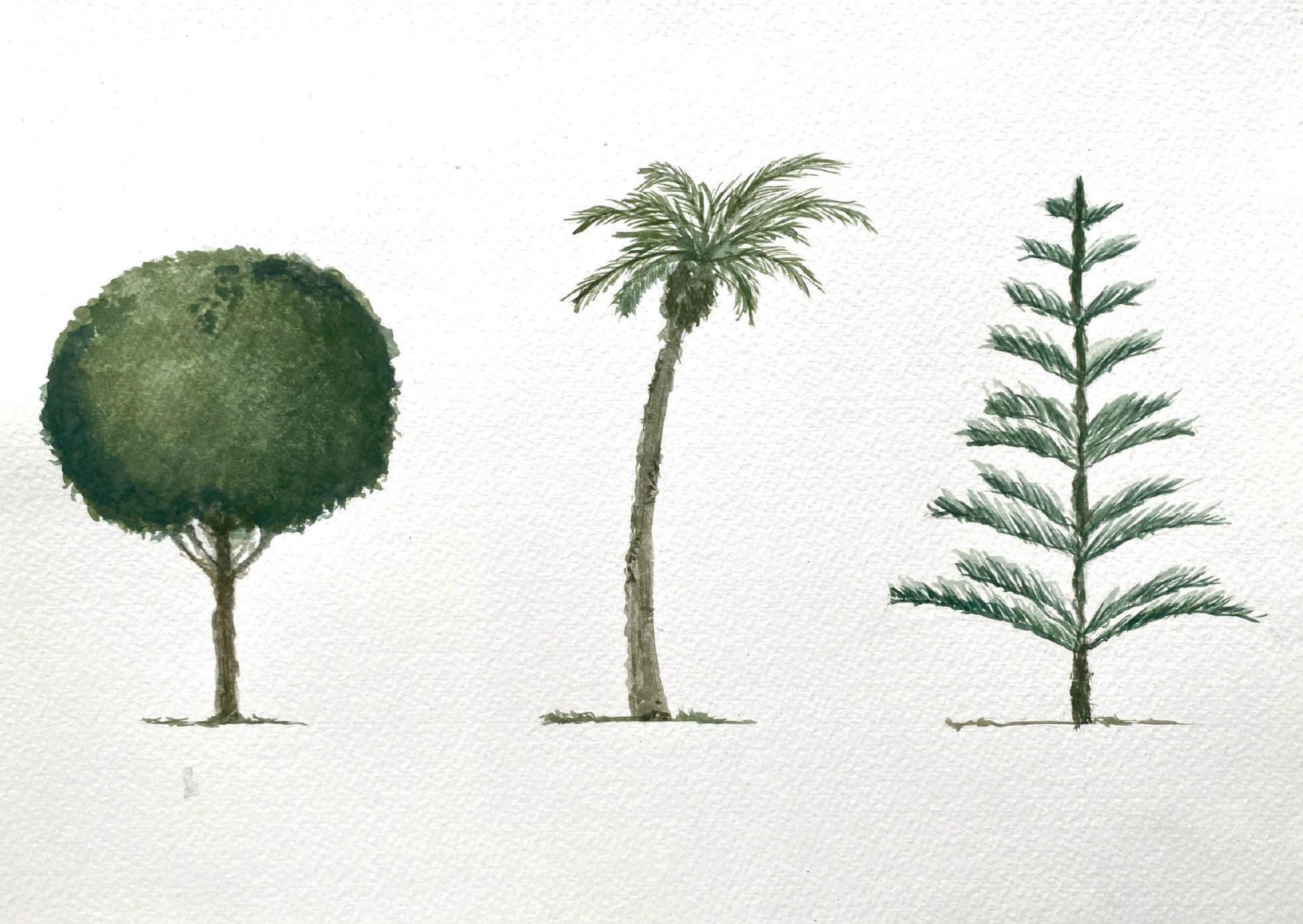 Se dibujaron tres tipos de árboles: Ficus, Palmera y Pino. Además, la valoración era únicamente a base de color con acuarelas.
