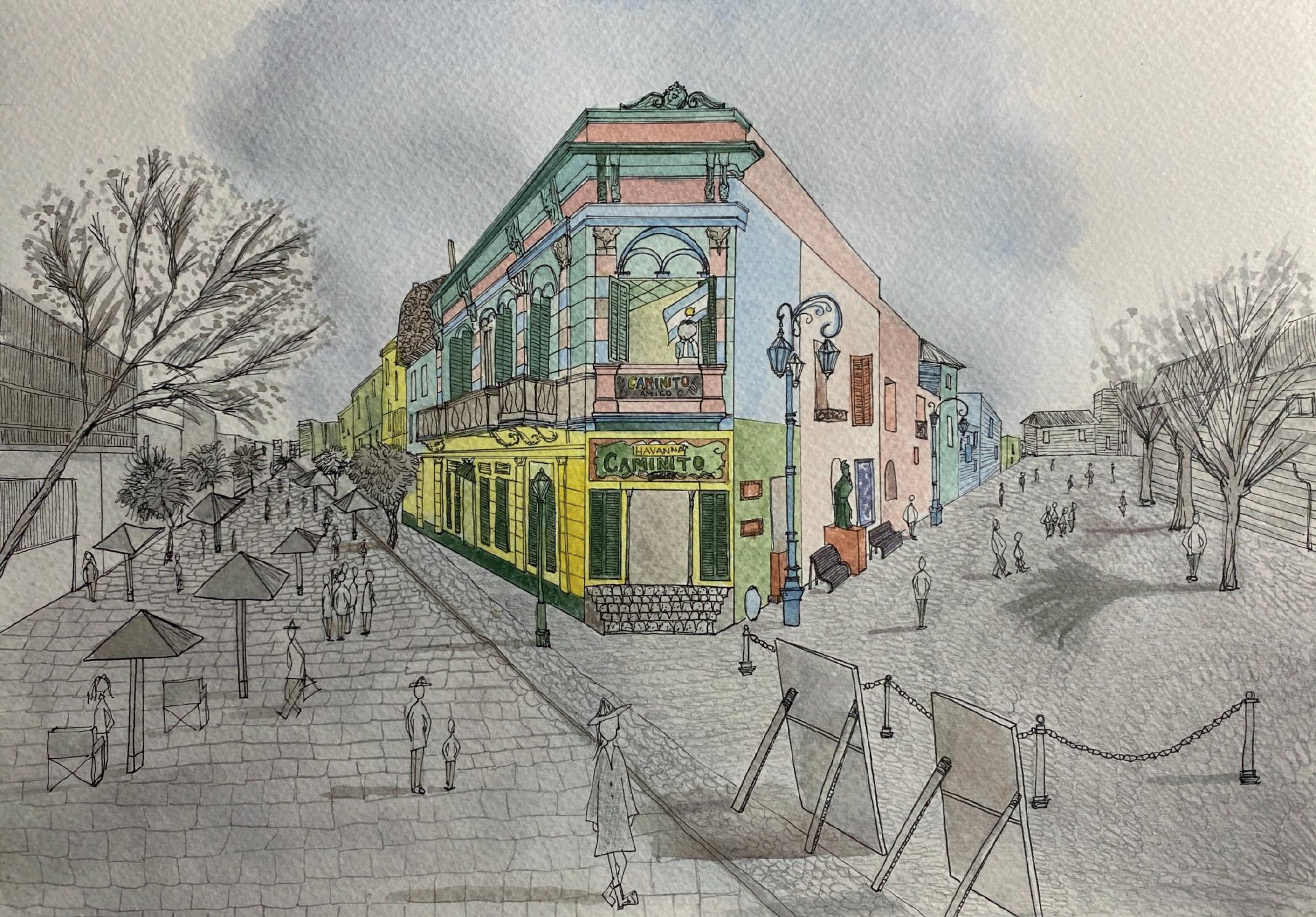 El apunte final del semestre fue de carácter totalmente libre, pero teniendo en cuenta las teorías y temas tratados durante todo el ciclo. Se optó por una perspectiva con dos puntos de fuga de el famoso “Caminito” en Buenos Aires.