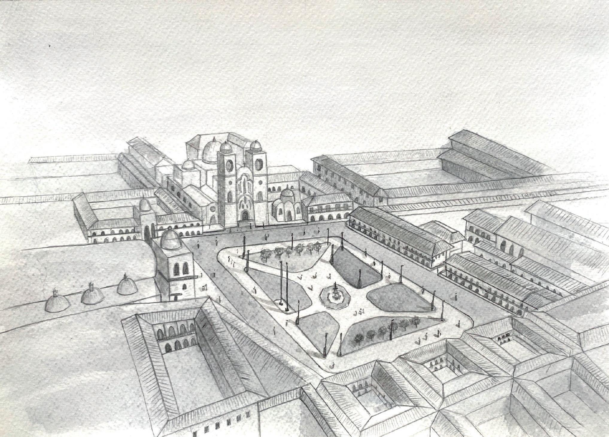 Se realizó el apunte con tres puntos de fuga de la Plaza de Armas de Cusco. El encargo indicaba que la valoración podía ser a lapiz o estilógrafo pero en B/N.