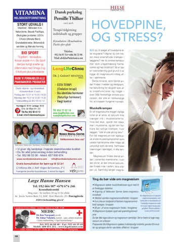 HOVEDPINE, K OG STRESS? M Er du tit plaget af hovedpine eller migræne? Vågner du om natten med smertefulde kramper i læggene? Har du stress-symptomer som uregelmæssig hjerterytme og højt blodtryk? Så er der en overordentlig god grund til at kigge dit magnesium-indtag efter i sømmene. Dette mineral, som blandt andet findes i nødder og bladgrønt, har betydning for så godt som alle kropsfunktioner og indgår i over 300 forskellige enzym-processer, der alle er nødvendige for, at kroppen fungerer normalt.