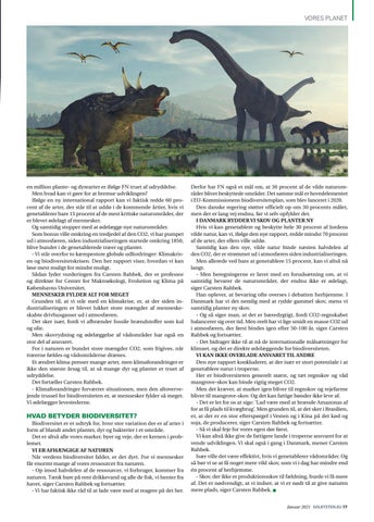 Derfor har FN også et mål om, at 30 procent af de vilde naturområder bliver beskyttede områder. Det samme mål er hovedelementet i EU-Kommissionens biodiversitetsplan, som blev lanceret i 2020. Den danske regering støtter officielt op om 30 procents målet, men der er lang vej endnu, før vi selv opfylder det. I DANMARK RYDDER VI SKOV OG PLANTER NY Hvis vi kan genetablere og beskytte hele 30 procent af Jordens vilde natur, kan vi, ifølge den nye rapport, redde mindst 70 procent af de arter, der ellers ville uddø. Samtidig kan den nye, vilde natur binde næsten halvdelen af den CO2, der er strømmet ud i atmosfæren siden industrialiseringen. Men allerede ved bare at genetablere 15 procent, kan vi altså nå langt. - Men beregningerne er lavet med en forudsætning om, at vi samtidig bevarer de naturområder, der endnu ikke er ødelagt, siger Carsten Rahbek. Han oplever, at bevaring ofte overses i debatten herhjemme. I Danmark har vi det nemlig med at rydde gammel skov, mens vi samtidig planter ny skov. - Og så siger man, at det er bæredygtigt, fordi CO2-regnskabet balancerer sig over tid. Men reelt har vi lige smidt en masse CO2 ud i atmosfæren, der først bindes igen efter 50-100 år, siger Carsten Rahbek og fortsætter. - Det bidrager ikke til at nå de internationalle målsætninger for klimaet, og det er direkte ødelæggende for biodiversiteten. VI KAN IKKE OVERLADE ANSVARET TIL ANDRE Den nye rapport konkluderer, at der især er stort potentiale i at genetablere natur i troperne. Her er biodiversiteten generelt størst, og tæt regnskov og våd mangrove-skov kan binde rigtig meget CO2. Men det kræver, at marker igen bliver til regnskov og rejefarme bliver til mangrove-skov. Og det kan fattige bønder ikke leve af. - Det er let for os at sige: ’Lad være med at brænde Amazonas af for at få plads til kvægbrug’. Men grunden til, at det sker i Brasilien, er, at der er en stor efterspørgel i Vesten og i Kina på det kød og soja, de producerer, siger Carsten Rahbek og fortsætter. - Så vi skal feje for vores egen dør først. Vi kan altså ikke give de fattigere lande i troperne ansvaret for at vende udviklingen. Vi skal også i gang i Danmark, mener Carsten Rahbek. Især ville det være effektivt, hvis vi genetablerer vådområder. Og så bør vi se at få noget mere vild skov, som vi i dag har mindre end én procent af herhjemme. - Skov, der ikke er produktionsskov til fældning, burde vi få mere af. Det er nødvendigt, at vi indser, at vi er nødt til at give naturen mere plads, siger Carsten Rahbek. Januar 2021 · SOLKYSTEN.EU 77