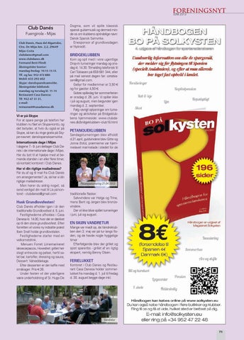 FORENINGSNYT JUNI 2013 Club Danés Fuengirola - Mijas Club Danés, Haza del Algarrobo, Ctra. De Mijas km. 2,2, 29649 Mijas Costa clubdanes@gmail.com www.clubdanes.dk Formand Bent Flindt Åbningstider kontor: mandag-fredag: 10.15-13.15. Tlf. og fax: 952 472 880 Mobil: 635 292 602 Skype: danskspansksamvirke. Åbningstider bibliotek: mandag og torsdag kl. 11-13 Restaurant Casa Danesa: Tlf. 952 47 51 51, e-mail: restaurant@casadanesa.dk