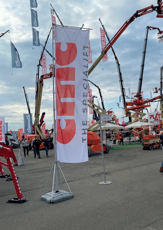 “Nello spazio di una fiera, un’azienda deve ‘svettare’ in tutta la propria evidenza. Solo così l’immagine di un marchio diventa un valore assoluto, una dichiarazione di identità che dà forza ai prodotti e alle strategie”. Le parole di Riccardo Gnani, responsabile commerciale di Studio Stands, sono una dedica al significato più autentico che deve assumere, sempre, una bandiera. Parliamo di una bandiera vera e propria, come quelle che dominano il cielo delle esposizioni internazionali, nel mondo del sollevamento in particolare, dove il simbolo di una realtà industriale deve sempre volare alto - spesso insediato sulla navicella di una piattaforma aerea o sul jib terminale di una gru.