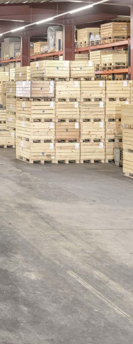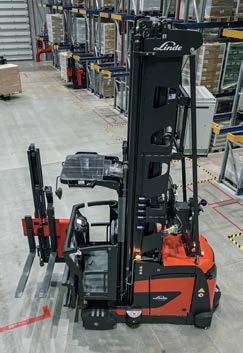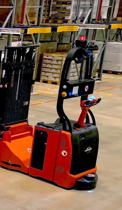 ad alta densità, organizzate in dieci corsie distinte, prevedono sei livelli di stoccaggio per una capienza totale di 4.600 posti pallet che ospitano 588 referenze. Ed è proprio in questo contesto che operano i carrelli automatici senza operatore a bordo. La flotta dei cinque stoccatori automatici L-Matic AC è incaricata delle operazioni di rifornimento inbound e outbound, con una capacità complessiva di 39 pallet all’ora, mentre la coppia di carrelli trilaterali K-Matic svolge l’attività in corsia, nell’area segregata