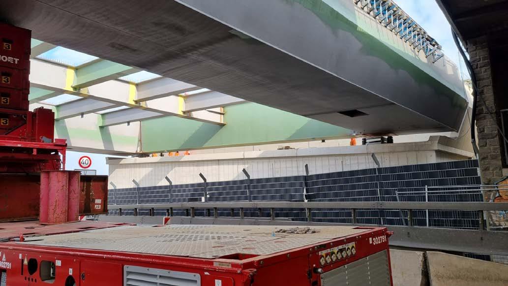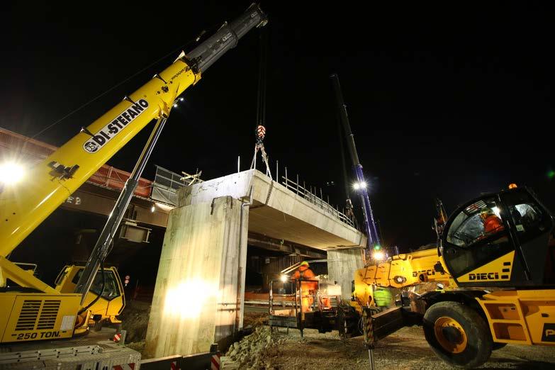 È di grande impatto visivo il nuovo layout del Viadotto Pionieri ed Aviatori d’Italia che scavalca Via Siffredi e la linea FS Geno va-Ventimiglia, arrivato nella sua sede dopo essere stato assem blato nel cantiere aperto in Via Siffredi, nell’area del vecchio di stributore; posizionato sul carrello modulare semovente SPMT della Fagioli, con una portata di 500 tonnellate, per passare sotto il cavalcavia Guido Rossa, con una operazione di traslazione raf finatissima condotta dalla direzione di Angelo Severini. Giunto nel cantiere, alla rotatoria di via Albareto sono iniziate le opera zioni di sollevamento. Dopo lo stop dovuto al maltempo e all’al lerta gialla con i conseguenti allagamenti della zona del ponente, nella notte tra sabato e domenica si è compiuta l’operazione forse più scenografica e complicata: l’impalcato è stato sollevato grazie all’ausilio di quattro jack up dalla capacità complessiva di 2.000 tonnellate e in seguito spostato, e ruotato fino a raggiungere la posizione di insediamento. Tramite i sistemi di sollevamento jack up e Gantry System, i carrelli semoventi SPMT, i martinetti a re cupero dei cavi Strand Jack e con l’ausilio di gru ad alta capacità, il capolavoro si è compiuto. Il sistema jack up ha sollevato il pon te alla quota corretta di varo (11 m), permettendo di oltrepassare le abitazioni e gli ostacoli urbani. Il Gantry System ha permesso l’abbassamento finale del ponte sulle pile, centrandolo al milli metro; i carrelli semoventi hanno trasportato il ponte dall’area di montaggio all’area finale, districandosi tra le vie tortuose e il via dotto. Gli strand jack hanno traslato il ponte per farlo appoggiare sulle sue pile definitive, facendolo scivolare su rulli metallici. E le gru hanno sollevato e installato tutte le opere ausiliarie e i mac chinari. Ora l’impalcato d’acciaio diventerà la rampa propedeuti ca alla realizzazione della futura fermata Erzelli/Aeroporto.