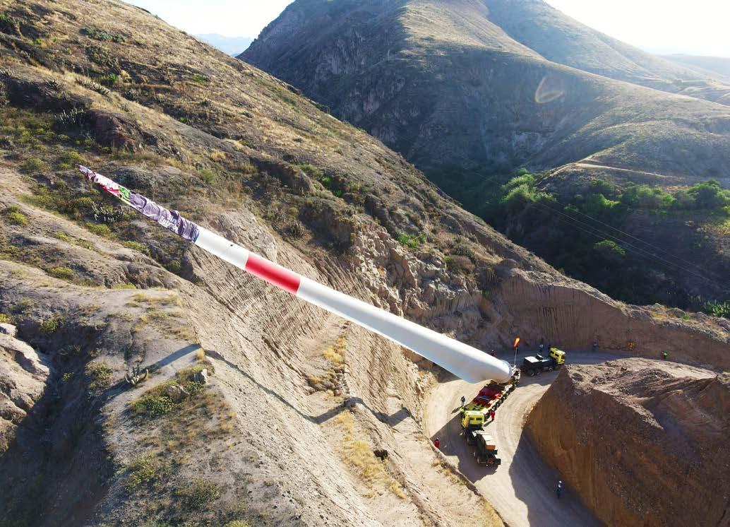 Sollevamento, Trasporti Eccezionali, Movimentazione Industriale e Portualetuali ostacoli durante il percorso. Questa attrezzatura costituisce la chiave per enor mi risparmi logistici e di tempo, in quanto riduce al minimo la necessità di rimuovere o apportare modifiche all'infrastruttura stradale. Con il sollevatore per pale FTV 550, montato su un modulo di semirimor chio Goldhofer THP/SL per impieghi gra vosi, Transportes Montejo è stato in grado di trasportare moduli di pale lunghi 73 m per una turbina eolica Dongfang da 4 MW, lungo la strada tortuosa che porta al cantiere, su un altopiano delle Ande. In un terreno così impervio, il sollevato re a pale Goldhofer FTV ha fornito una dimostrazione convincente delle proprie capacità, con l'equipaggio del Transpor tes Montejo che ha messo in campo tutta la sua abilità professionale nell’elevare e ruotare le pale per evitare il contatto con i pendii ripidi dell’altopiano, mentre il convoglio si faceva strada nell’incedere maestoso e trionfale fino alla meta in alti tudine del parco eolico.