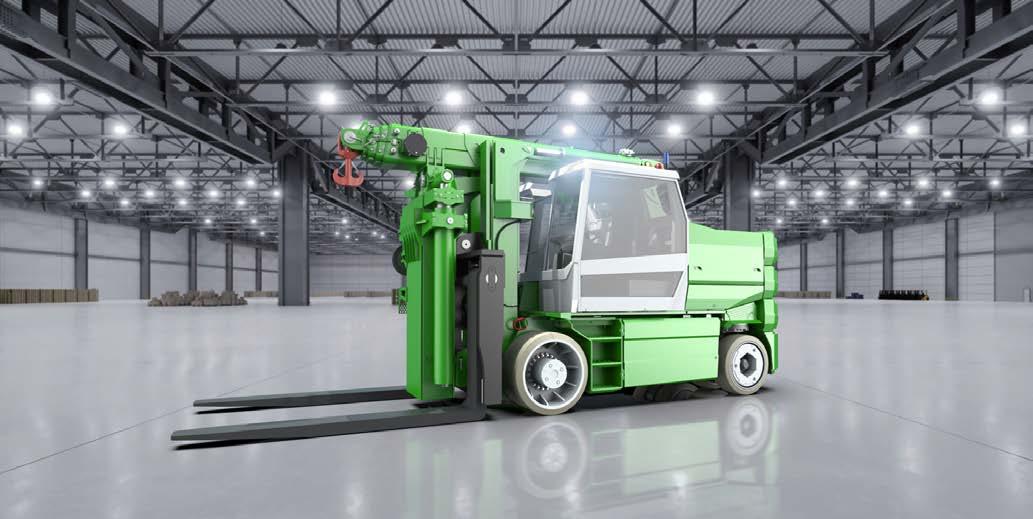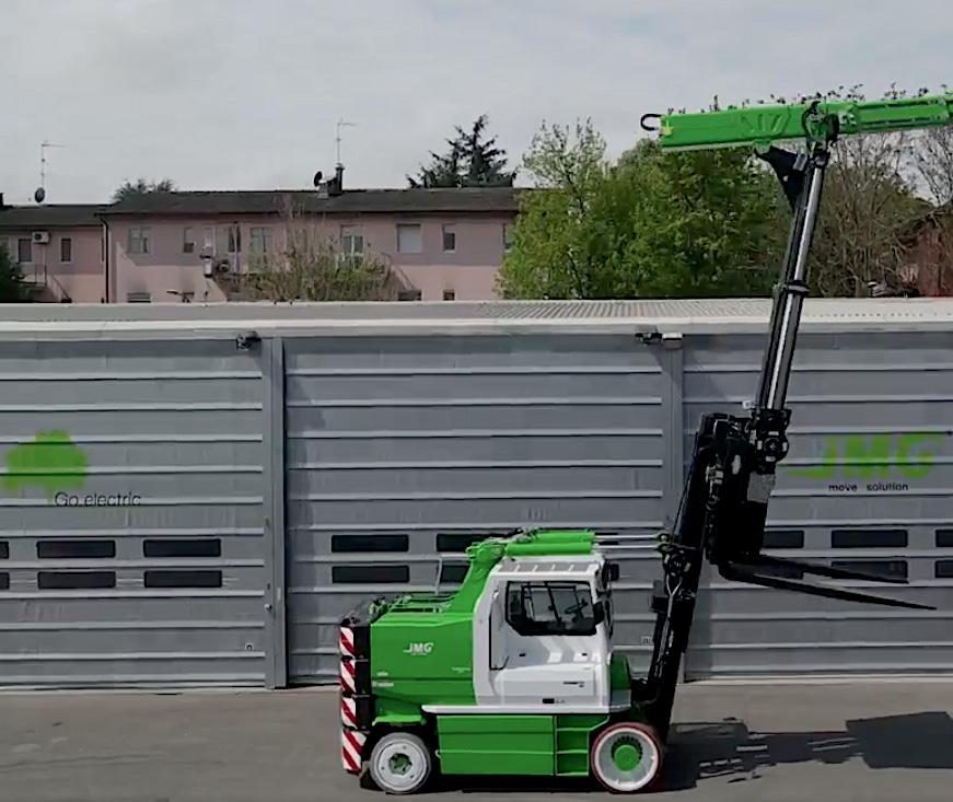 MC250.09FL, le ruote anteriori motrici con controrotazione - tramite due mo tori elettrici AC 12kW/96V -, un mon tante di sollevamento con inclinazione di +12/-7° e contrappesi rimovibili, per una portata massima (forche con gruppo aperto/chiuso) di 25/16,5 ton a 0,9 m. Nel comfort operativo della nuova gru JMG, va compresa anche la cabina di ultima generazione, totalmente integrata e dalle funzionalità completamente elettriche, con la facoltà di costituire un’interfaccia con il radiocomando per gestire la mac