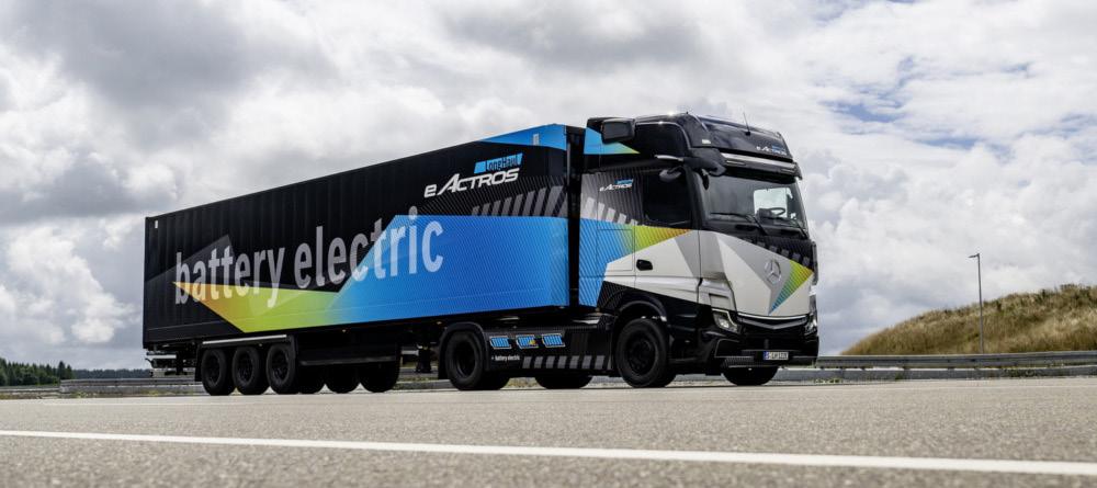 eActros LongHaul è il nome della sfida al trasporto pesan te full electric a lungo raggio, lanciata da Mercedes-Benz Trucks in anteprima allo IAA Transportation 2022. I visita tori della kermesse di Hannover hanno potuto ammirarne una versione concept che ne anticipa la produzione pre vista per il 2024. Autonomia fino ai 500 km e ricarica ad alte prestazioni ne testimoniano l’affidabilità in viaggio. La futura versione di serie sarà proposta con tre pacchi batteria – per una capacità totale installata di oltre 600 kWh – e due motori elettrici (parte di un nuovo assale elettrico) dalla potenza continua di 400 kW (e oltre 600 kW di picco). Oltre alla motrice per semirimorchio, Merce des-Benz Trucks produrrà fin dal lancio sul mercato anche varianti dell’eActros LongHaul con telaio cassonato. Altra novità presentata ad Hannover, il modello Mercedes-Benz eActros 300 elettrico a batteria nella variante motrice per semirimorchio, per l’impiego flessibile nel servizio di di stribuzione pesante. Come primo veicolo di serie comple tamente elettrico di Mercedes-Benz Trucks, l’eActros Lon gHaul sarà realizzato sfruttando la linea di montaggio già esistente nello stabilimento di Wörth (compreso l’assem blaggio di tutti i componenti elettrici e la messa in eserci zio del veicolo a fine linea). Per l’eActros 300/400, invece, l’elettrificazione avviene ad oggi in un processo separato all’interno del Future Truck Center di Wörth.