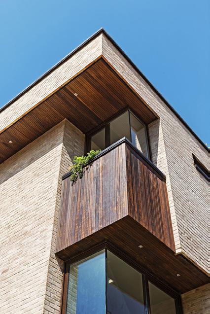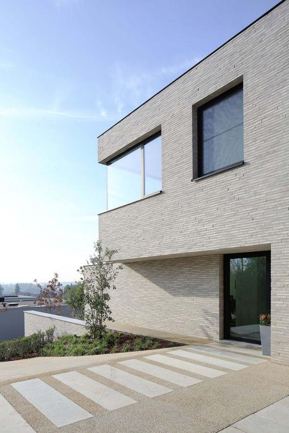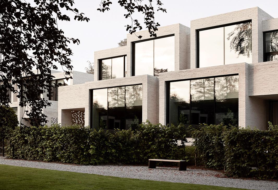 Fasadekledningen av lys, bløtstrøken murstein. Teglsteinens spesielle langformat og unike, ujevne overflate gir et tidløst utseende som er komplementert med moderne detaljer og formspråk.