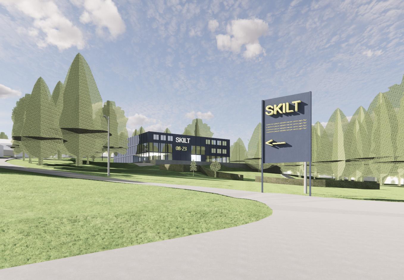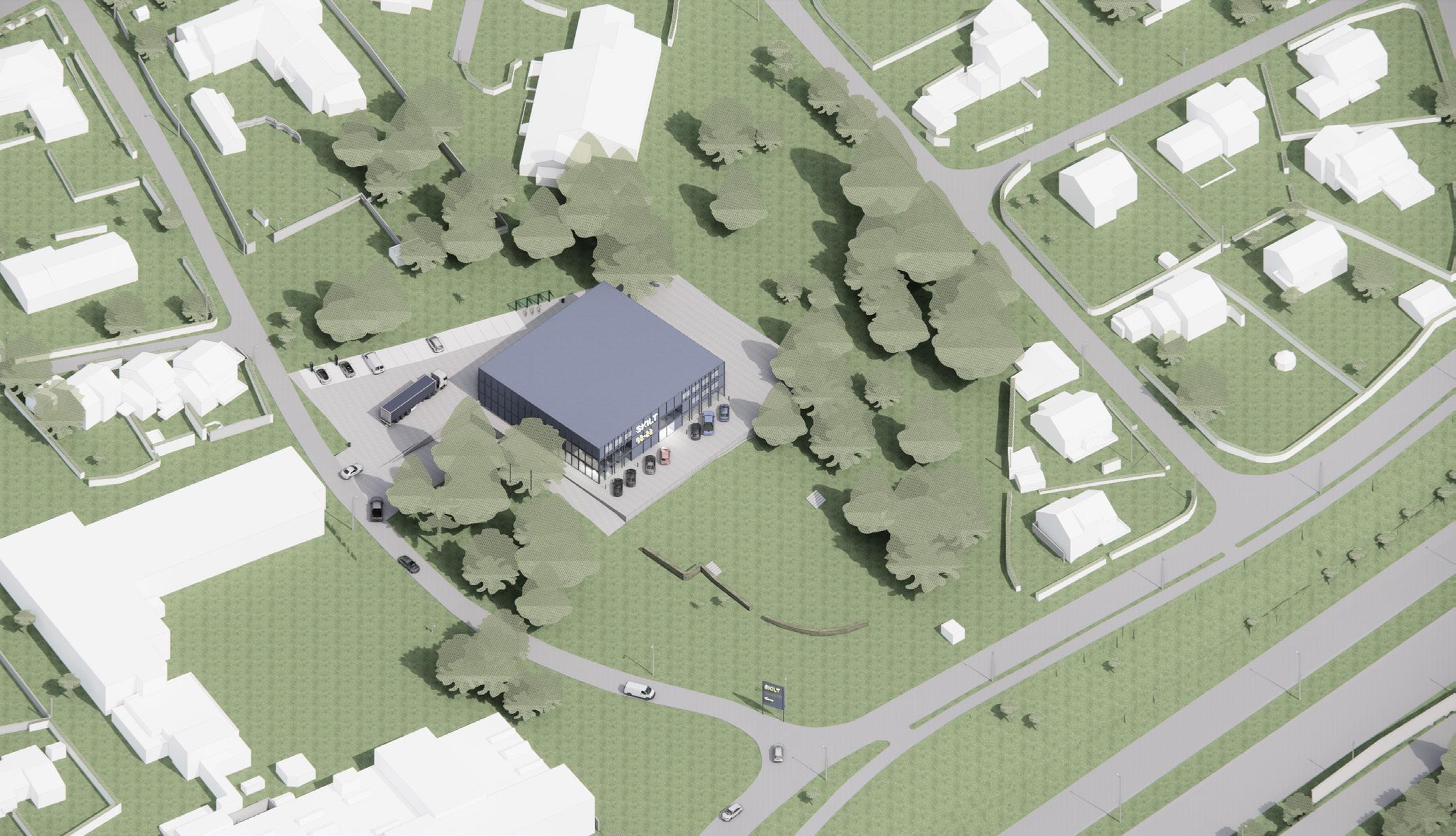 Formål « næringsvirksomhet/industri og grøntareal » er tegnet inn med et volum på ca 2500 kvm bruksareal fordelt på 3 etasjer med parkeringskjeller under terreng. Trær som er bevaringsverdig er ikke berørt. Tilhørende varelevering, adkomst og p-plass er tegnet inn.