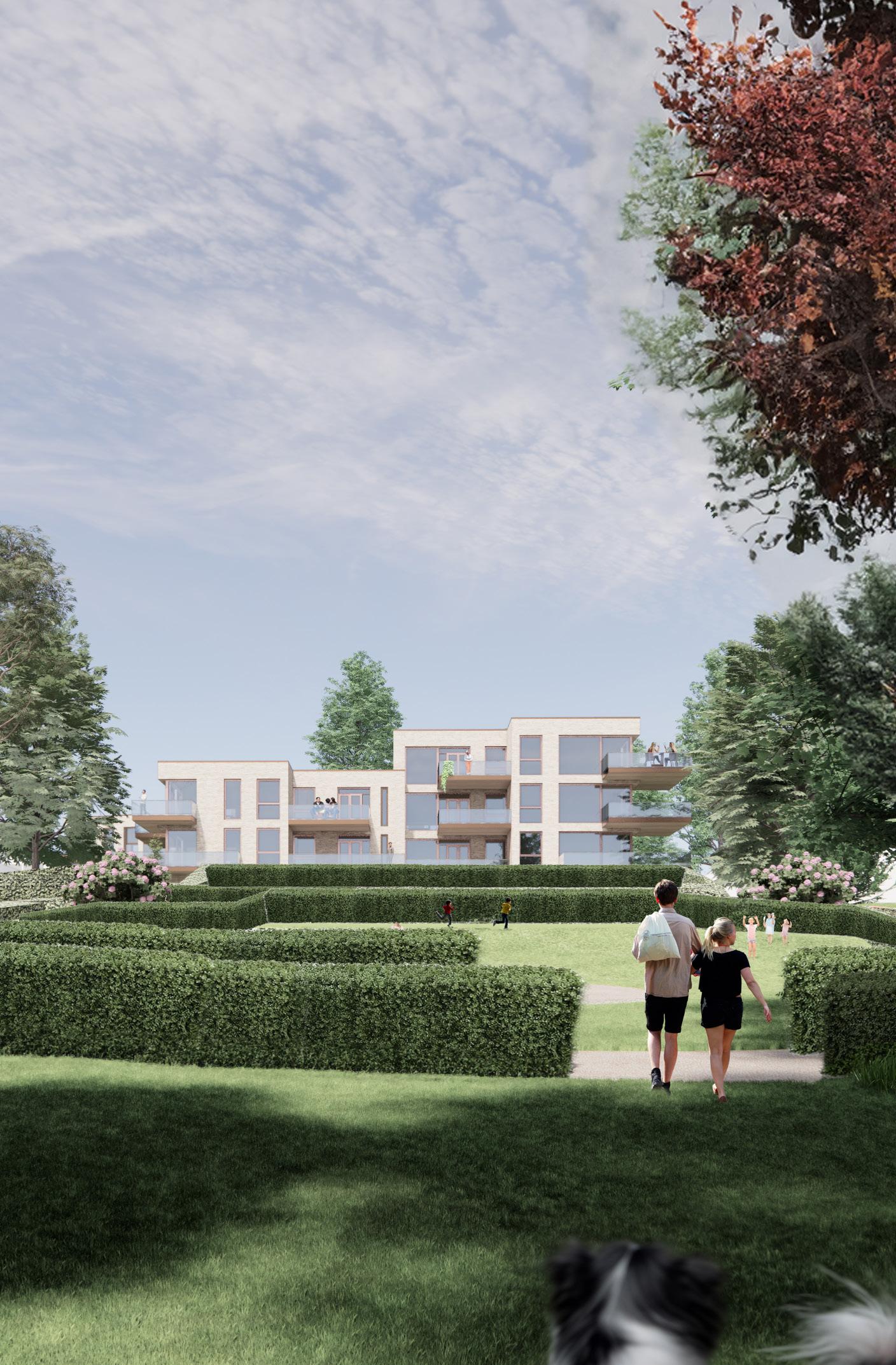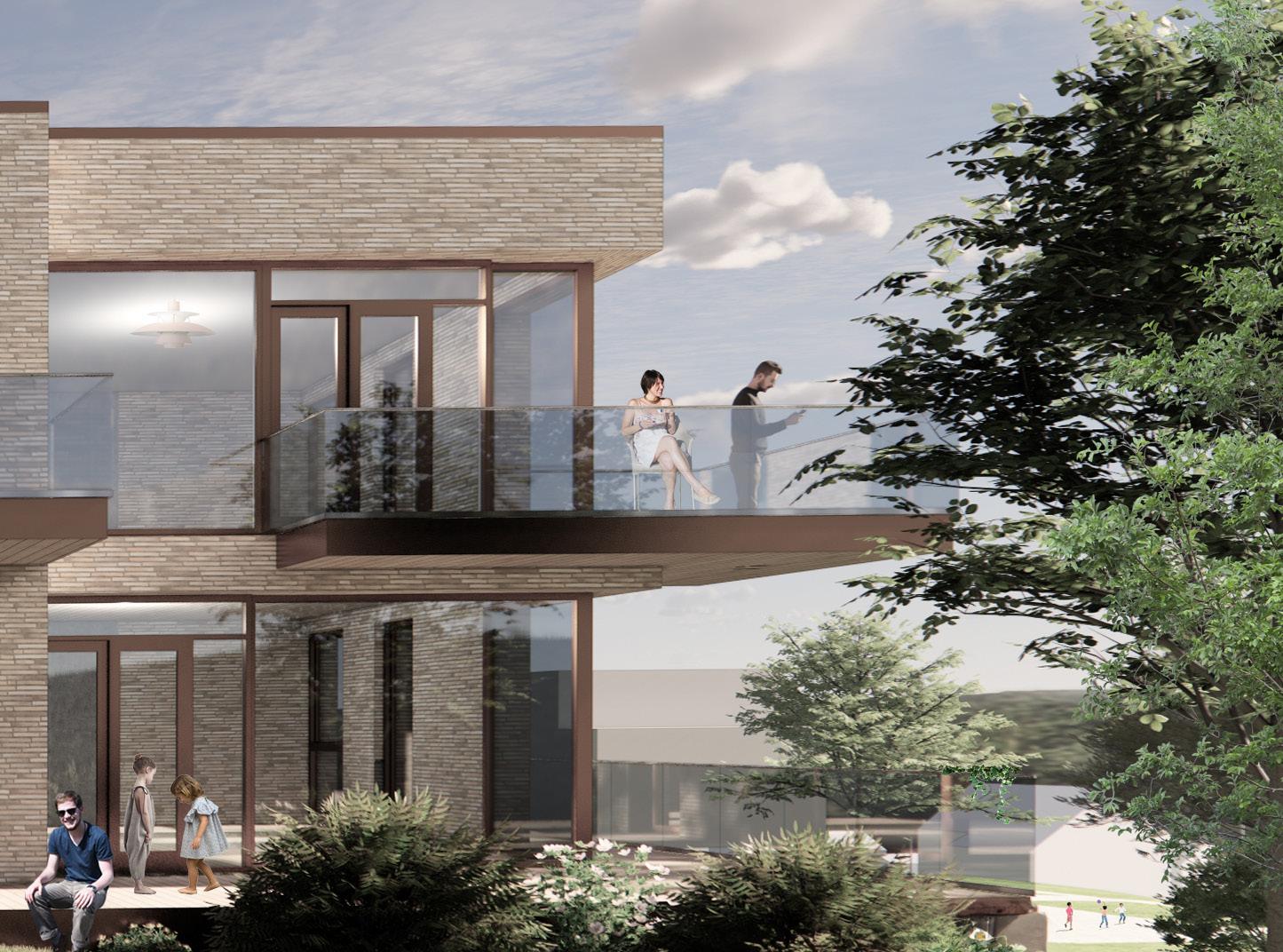 Leilighetene i 2 etasje er forbundet med terrenget mot nord og åpner opp for private hager.