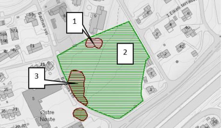 Naturtypeforekomstene nummerert 1 og 3 må bevares, parklandskapet (markert 2) bør ivaretas best mulig
