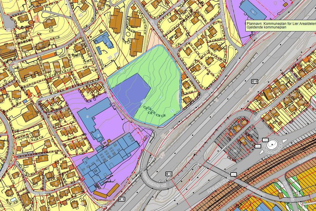 Nye Drammen sykehusI gjeldende reguleringsplan fra 1994 er området regulert til « Bevaringsområde Hageanlegg ». Planstatus er ikke i overenstemmelse med den nylige vedtatte kommuneplanen, hvor tomten har formål « næringsvirksomhet/industri og grøntareal ». Det er ingen igangsatt / pågående planarbeid i nærområdet og på samme side av E 18.
