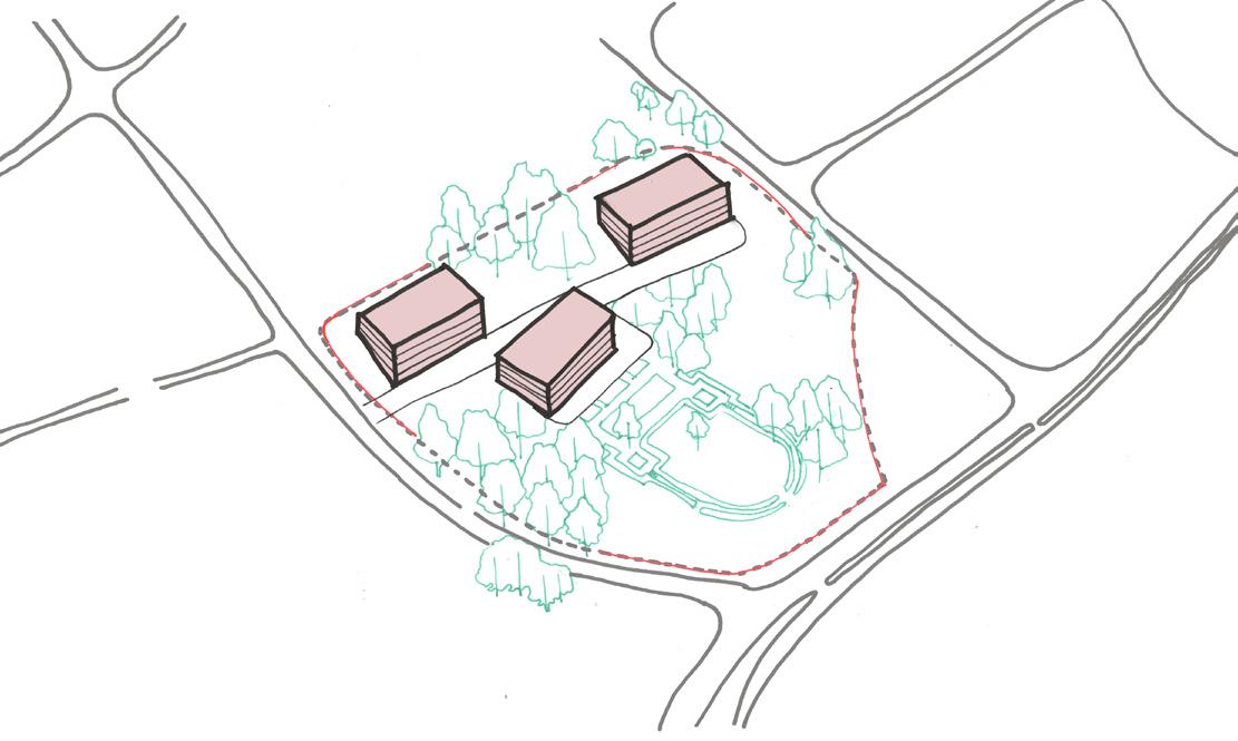 Det plasseres tre volumer mot nord. Volumet lengst frem mot historisk park plasseres der Villa Ekely gjorde en gang, for å ramme inn parken.