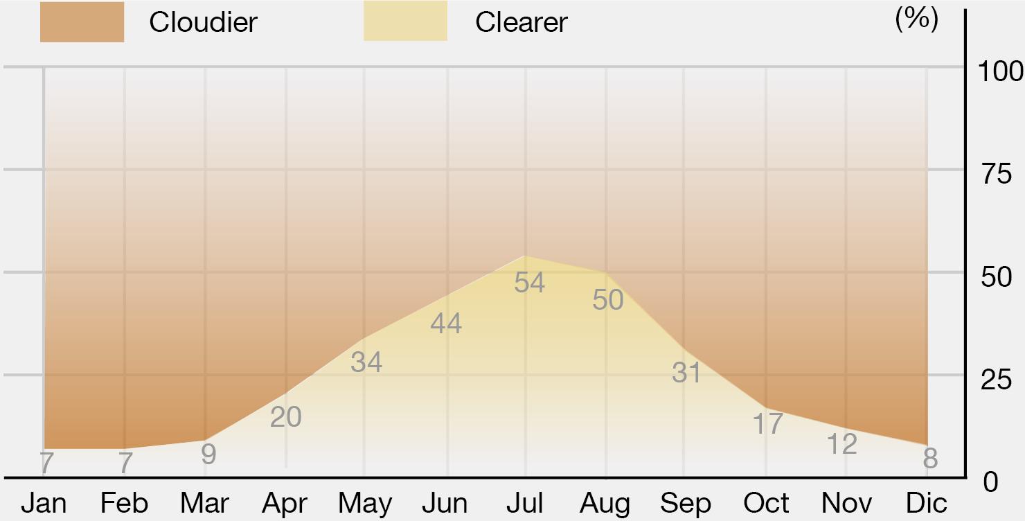 According to the percentage graph, July and August are the clearest months, with July being higher with 54%. While the least cloudy months are from December to February with an annual average of 7%.