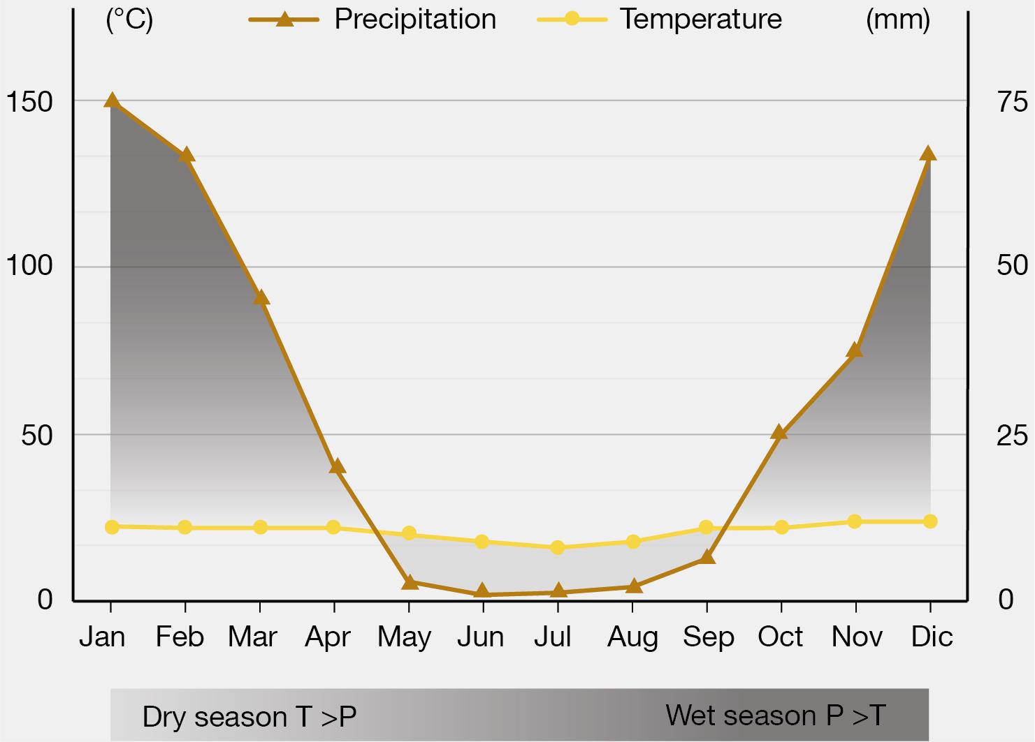 The extreme months start in December until March, reaching rainfall of more than 100 mm, with January being the wettest month of the year, with temperatures ranging between 11-12°C.