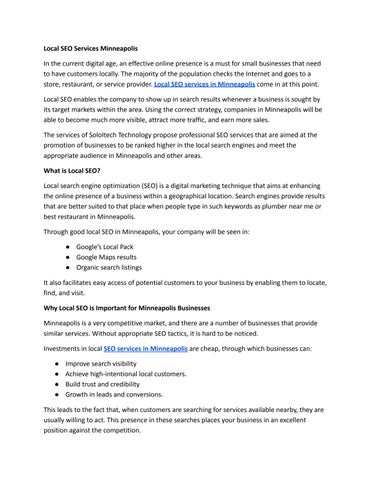 Soloitech is a performance-focused digital agency delivering expert SEO services in Minneapolis. We specialize in data-driven strategies, local SEO Minneapolis optimization, and customized search marketing campaigns that generate real business growth. Whether you're searching for seo services near me or need a long-term organic growth partner, our team combines technical expertise with proven marketing insights to elevate your online presence.