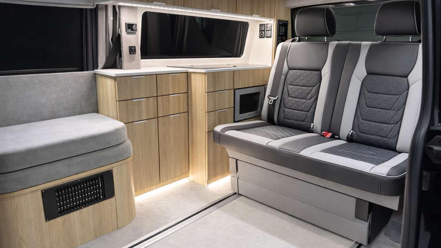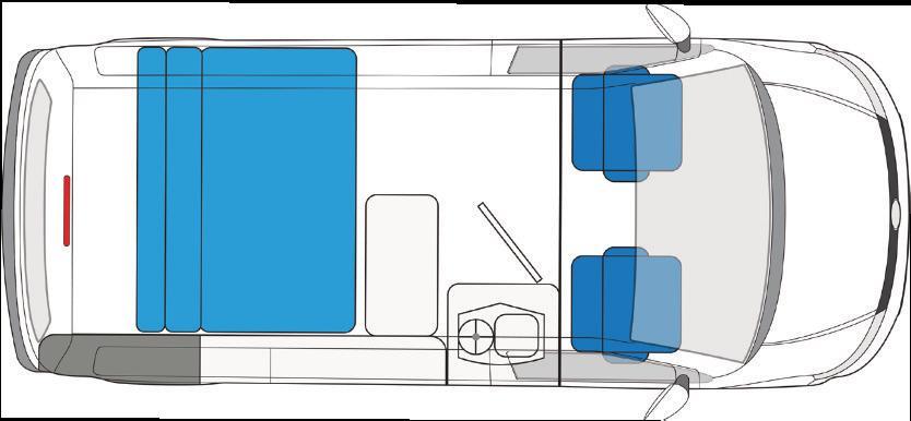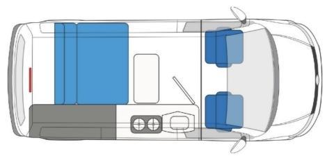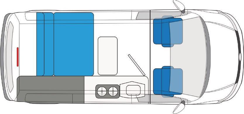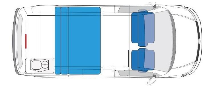 Our MARINA camper conversion layout features a larger M1 tested 3-seater RIB Altair bed, designed to meet the growing demand for better sleeping space and 5 or 6 traveling seats. With window views all around, enhanced by slimline low-level furniture, this layout sacrifices a small amount of storage space but strikes a perfect balance between meeting the camping and daily needs of a small family, while also functioning well as an everyday vehicle.