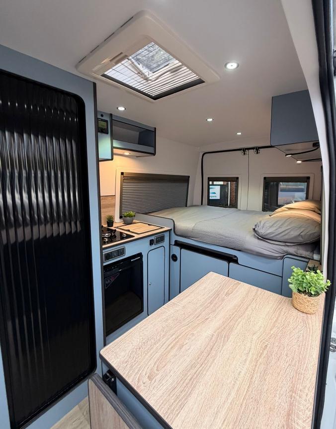 Step into comfort with our spacious, custom-designed Lanner layout, thoughtfully created for relaxing, dining, and making the most of your time on the road. The comfortable seating area transforms into a large two-berth bed, giving you the flexibility to travel and stay overnight with ease. With a fridge, gas hob, and sink on board, everything you need is right at your fingertips.
