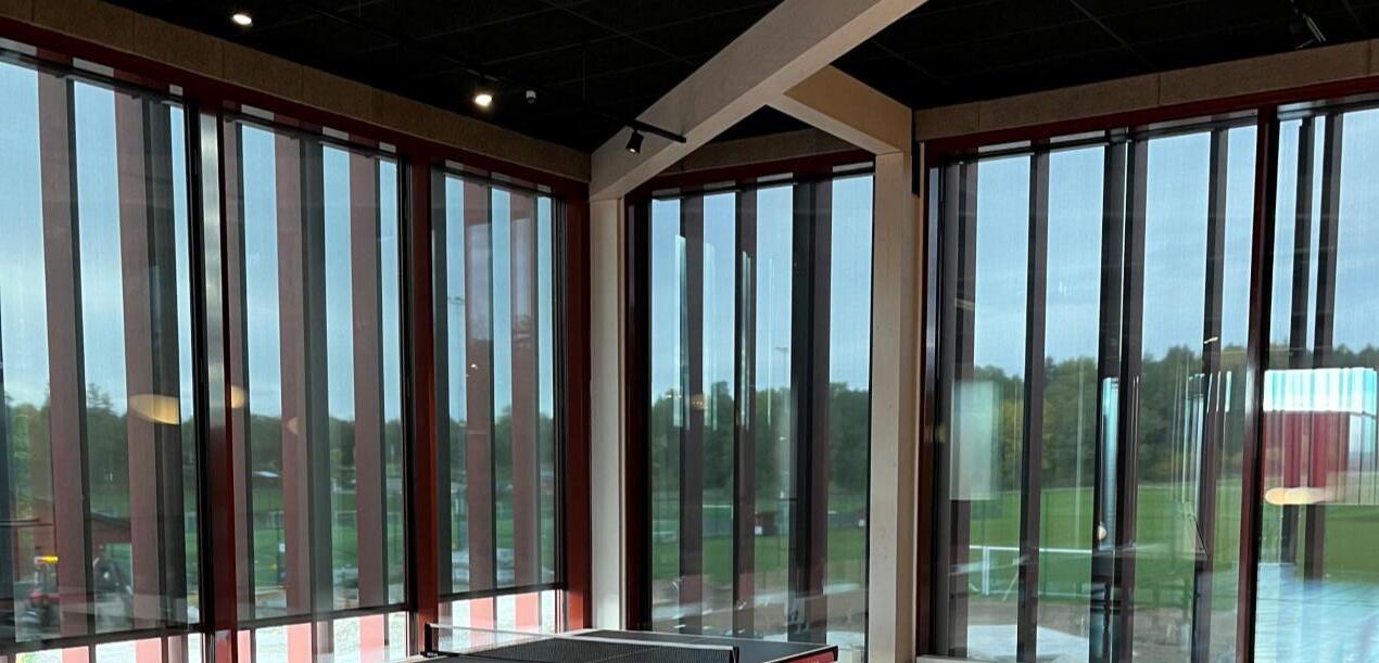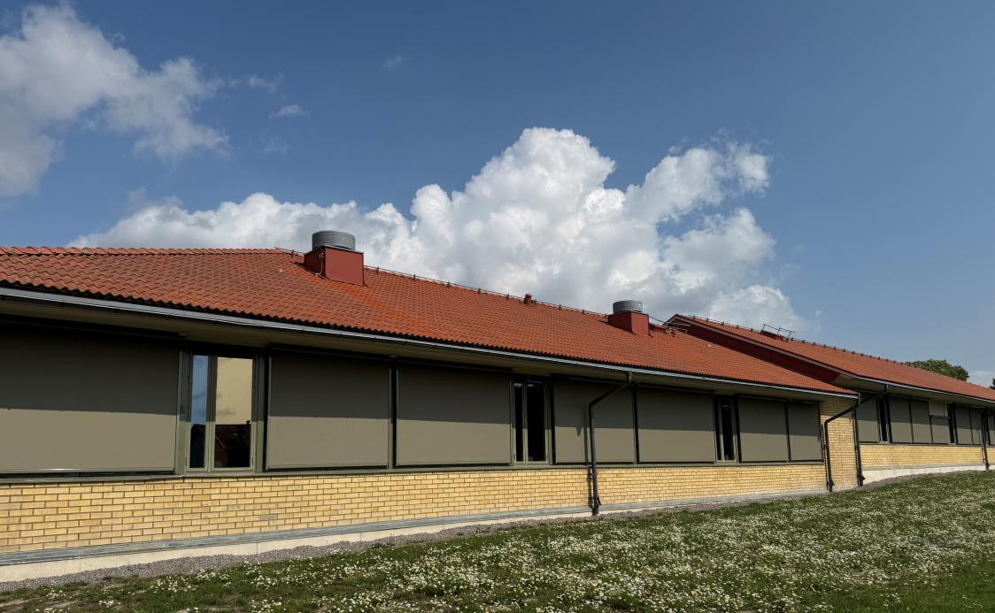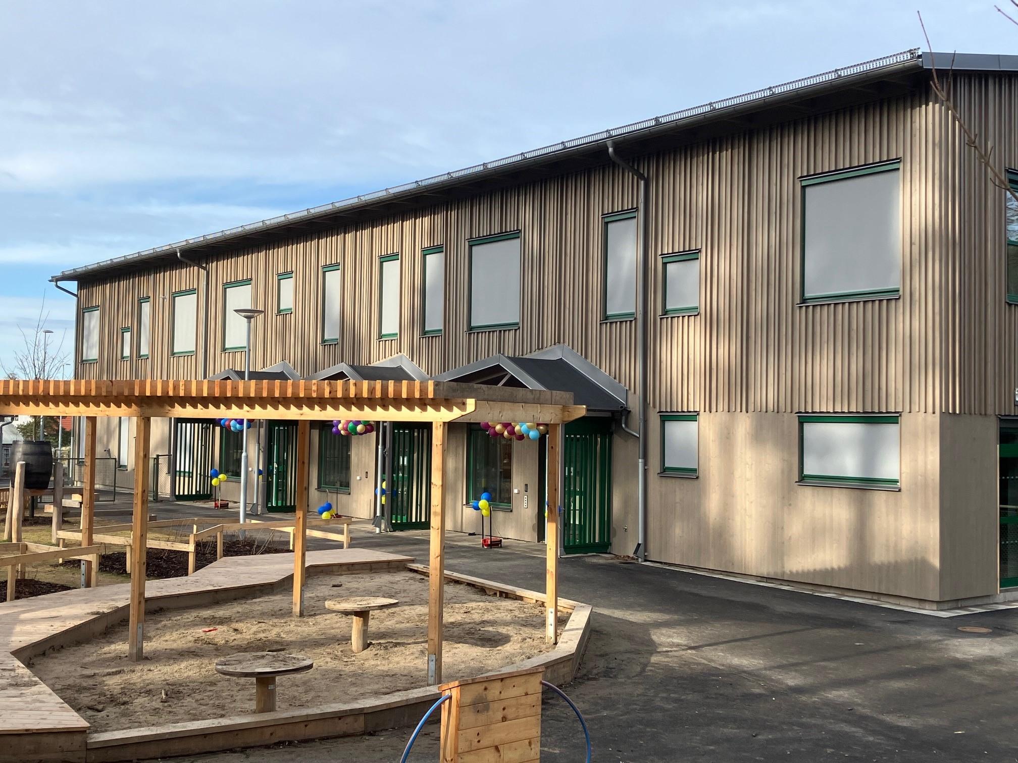De mjuka tonerna knyter an till byggnadens träfasad och omgivande natur. Solskyddet skapar svalare och mer trivsamma miljöer för lek och vila, samtidigt som barnens rum behåller ett generöst dagsljus