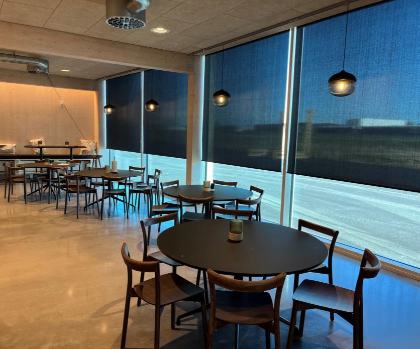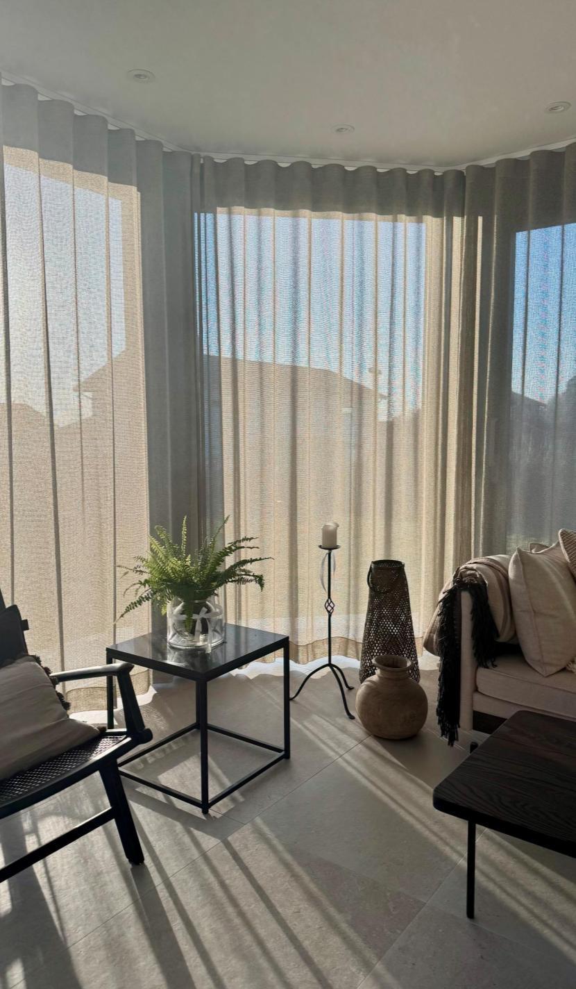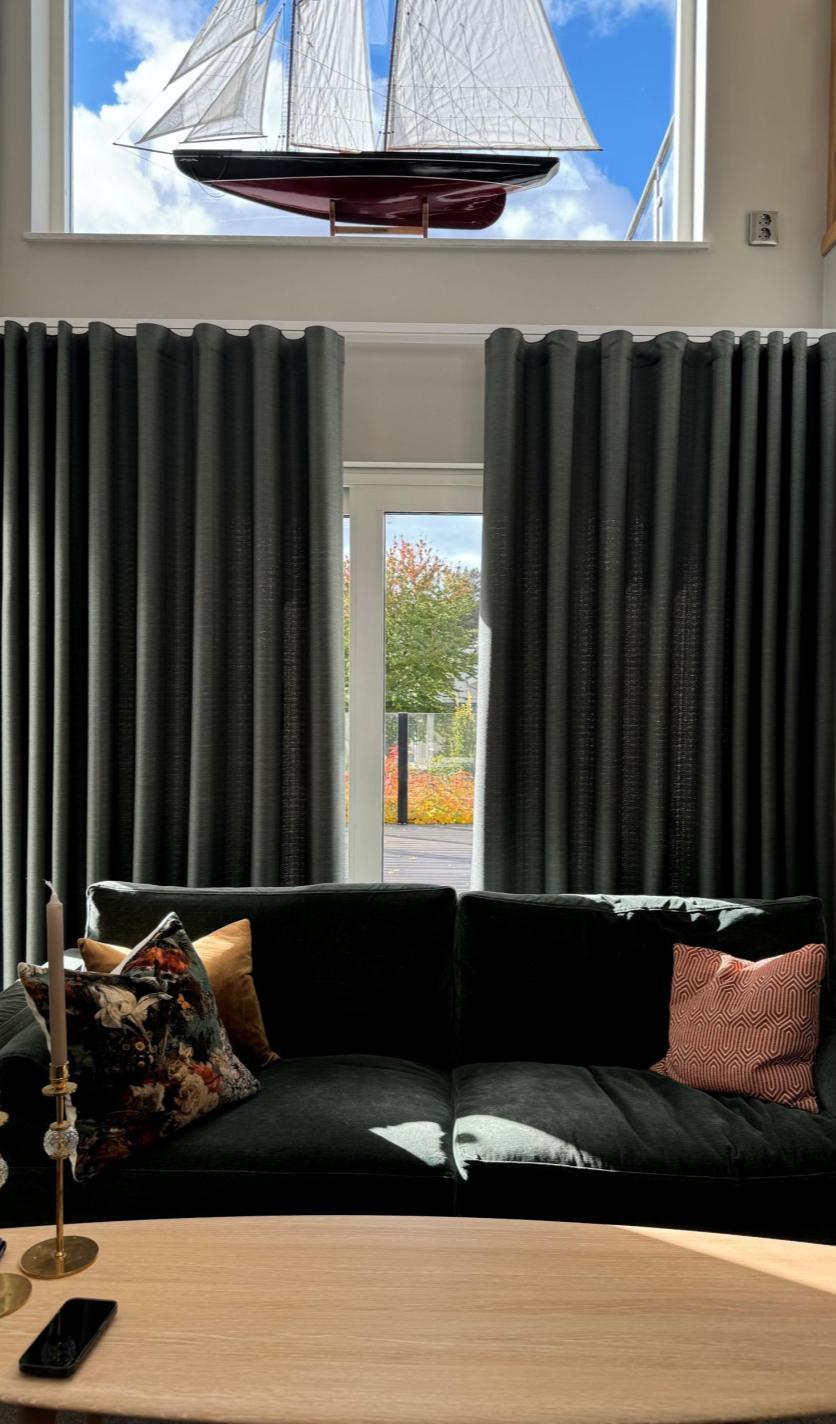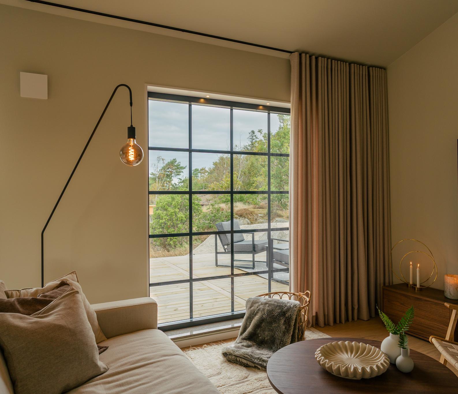 De stora screenvävarna skapar en mjuk ljusnivå, vilket gör rummet mer användbart under hela dagen. Här samspelar solskyddet med möblering och materialval till ett sammanhållet, lugnt och välkomnande inomhusklimat.