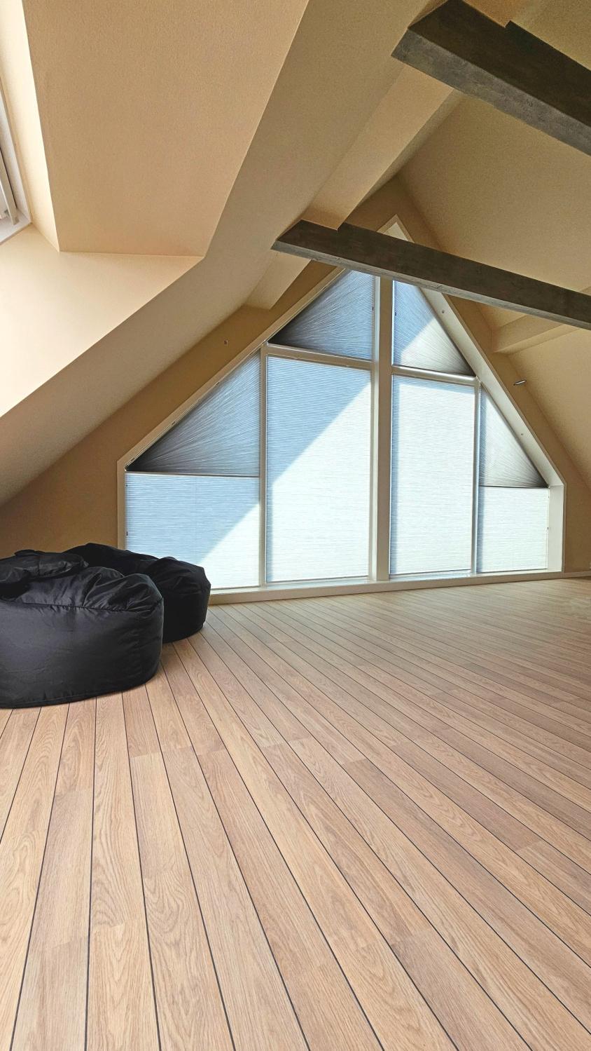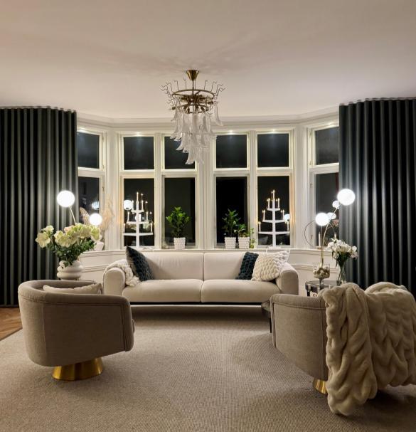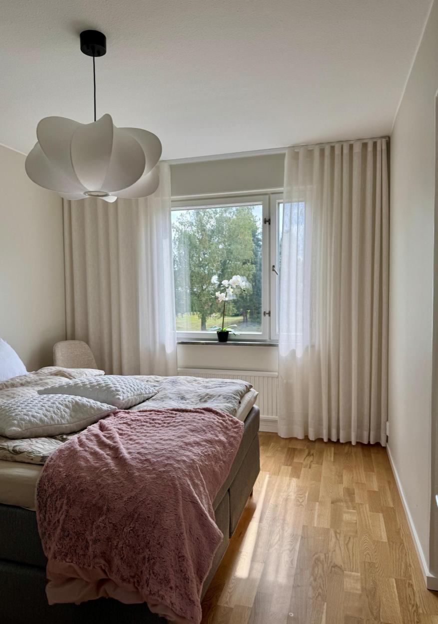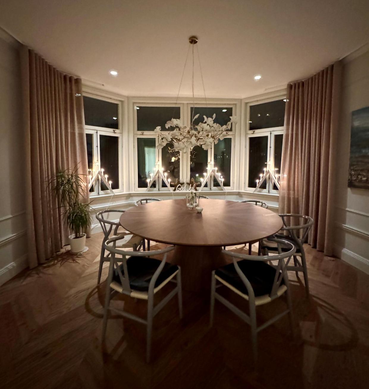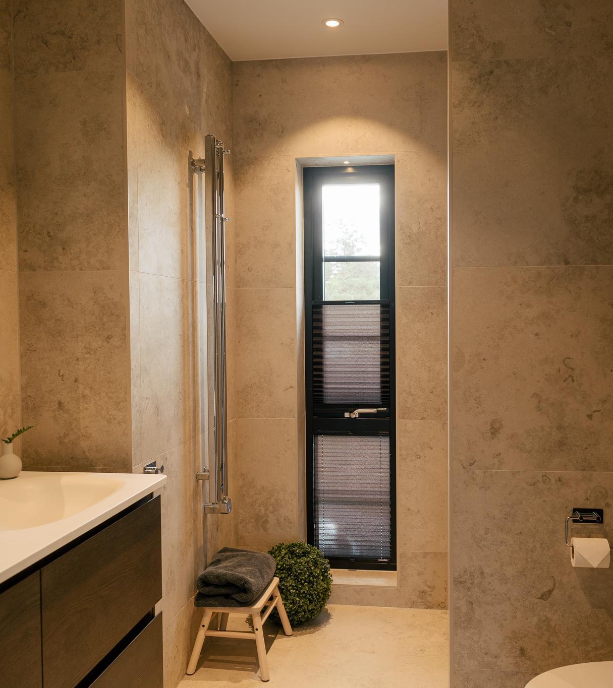 De stora screenvävarna skapar en mjuk ljusnivå, vilket gör rummet mer användbart under hela dagen. Här samspelar solskyddet med möblering och materialval till ett sammanhållet, lugnt och välkomnande inomhusklimat.