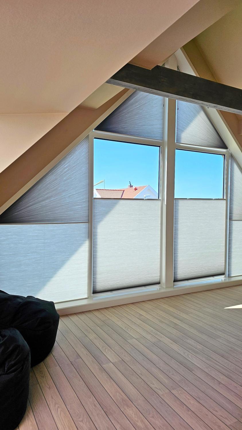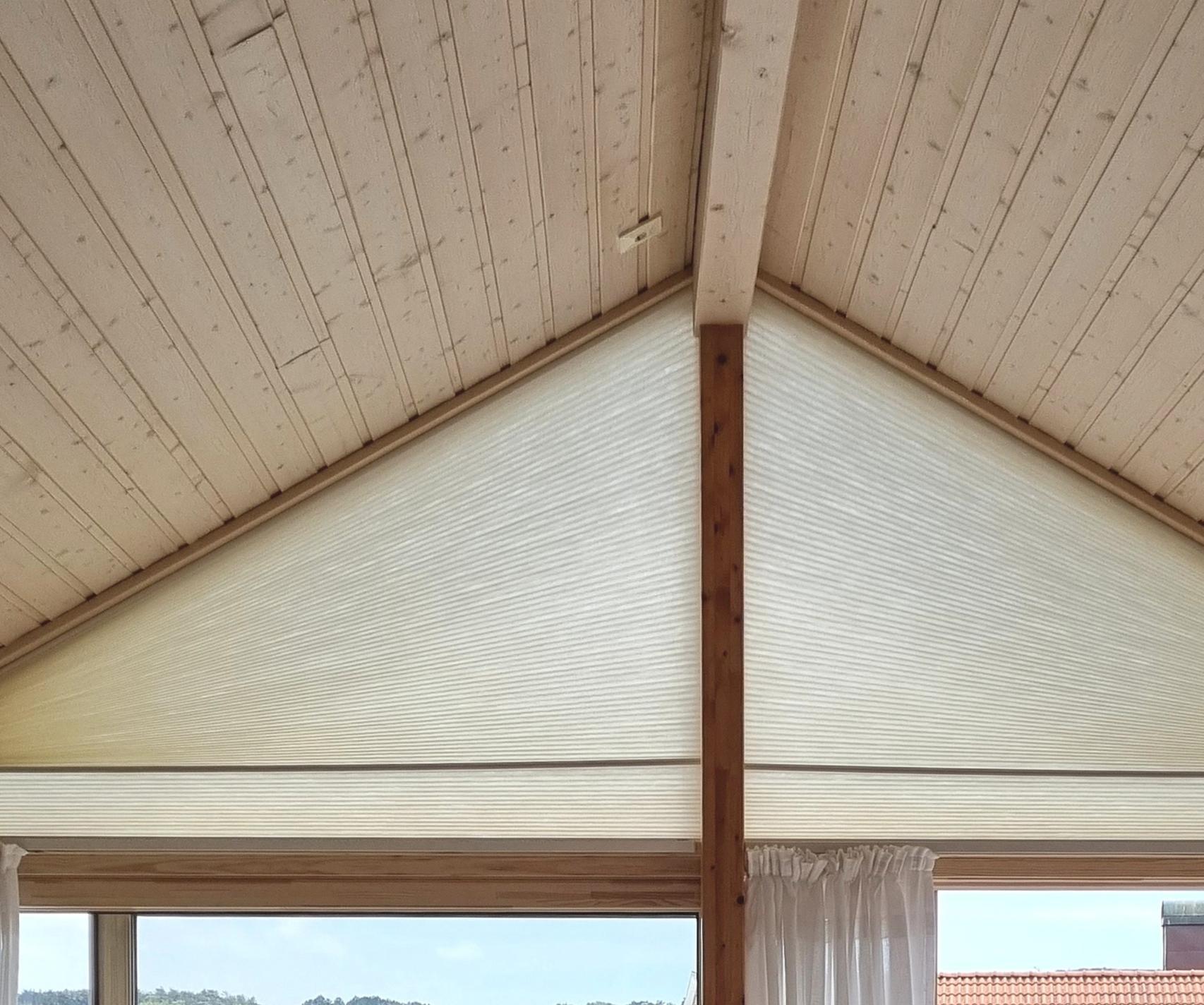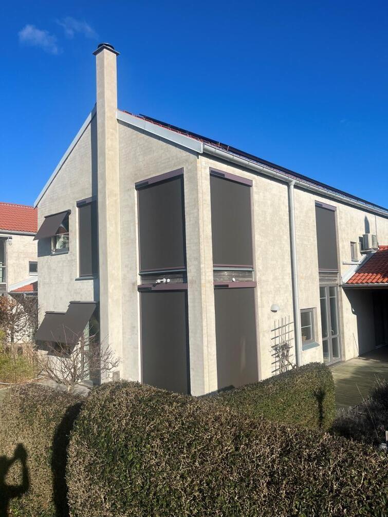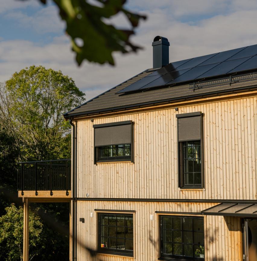 solskydden ger huset ett arkitektoniskt lyft genom tydlig kontrast mot den ljusa träpanelen. Samtidigt bidrar installationen till energieffektivitet genom att bromsa värmeinstrålning