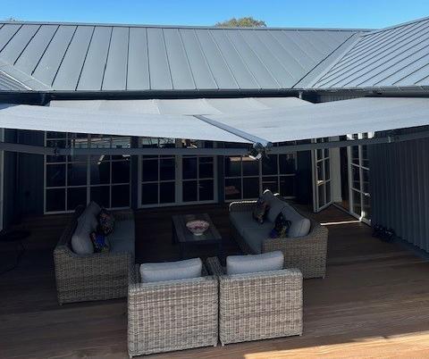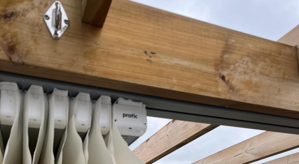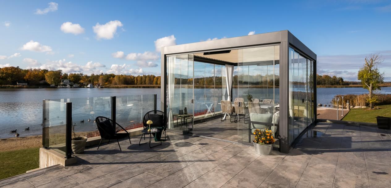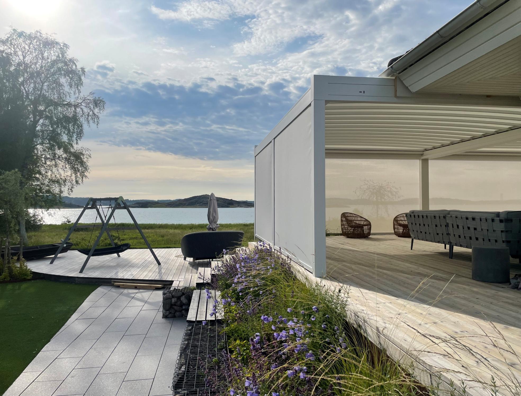 Precis som i en dröm –en pergola vid sjön Solskyddet skapar ett stilrent uterum där de mjuka, ljusa textilierna harmonierar med fasadens linjer och den öppna utsikten mot vattnet. Resultatet är en plats där inomhus- och utomhusliv flyter samman samtidigt som värme och bländning effektivt regleras. Björneröd