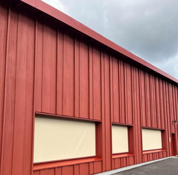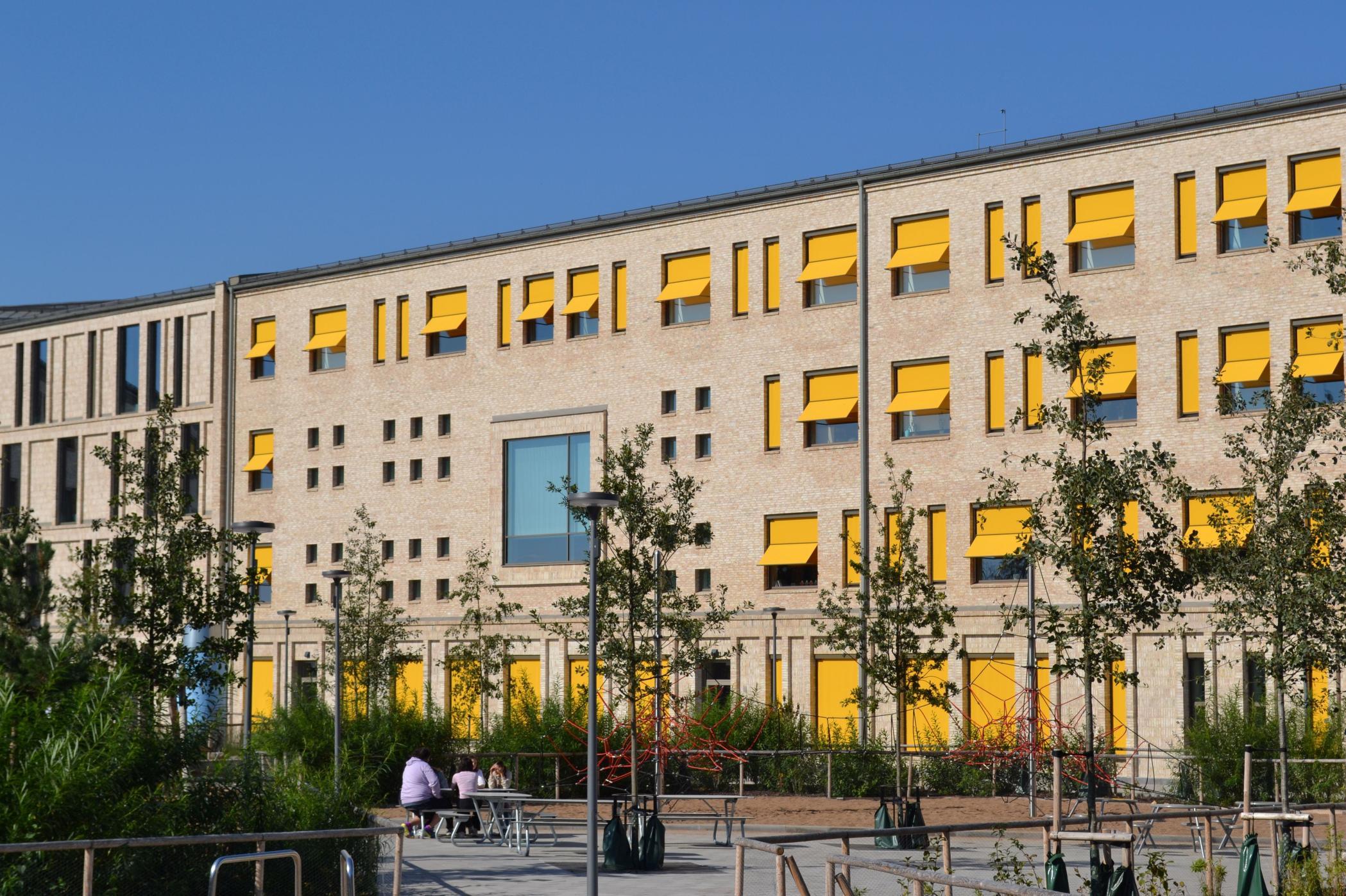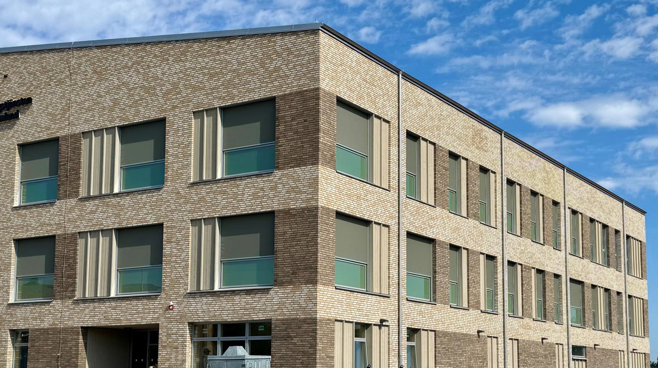 De klara gula solskydden ger byggnaden identitet och liv samtidigt som de minskar värmelast och bländning i klassrummen. En installation som förenar lekfull arkitektur med ett behagligare lärandeklimat.